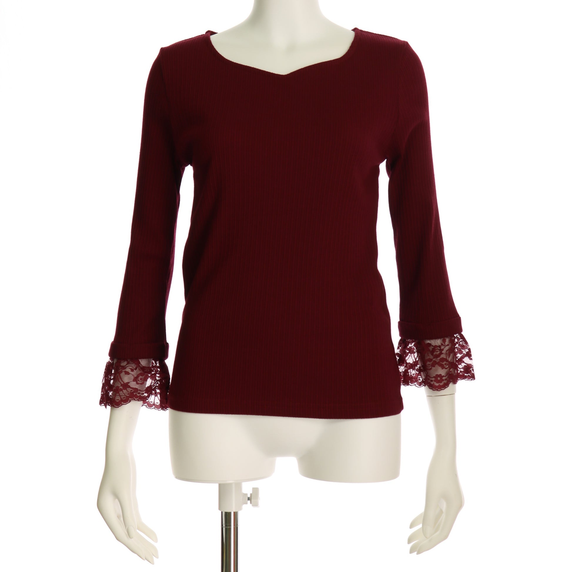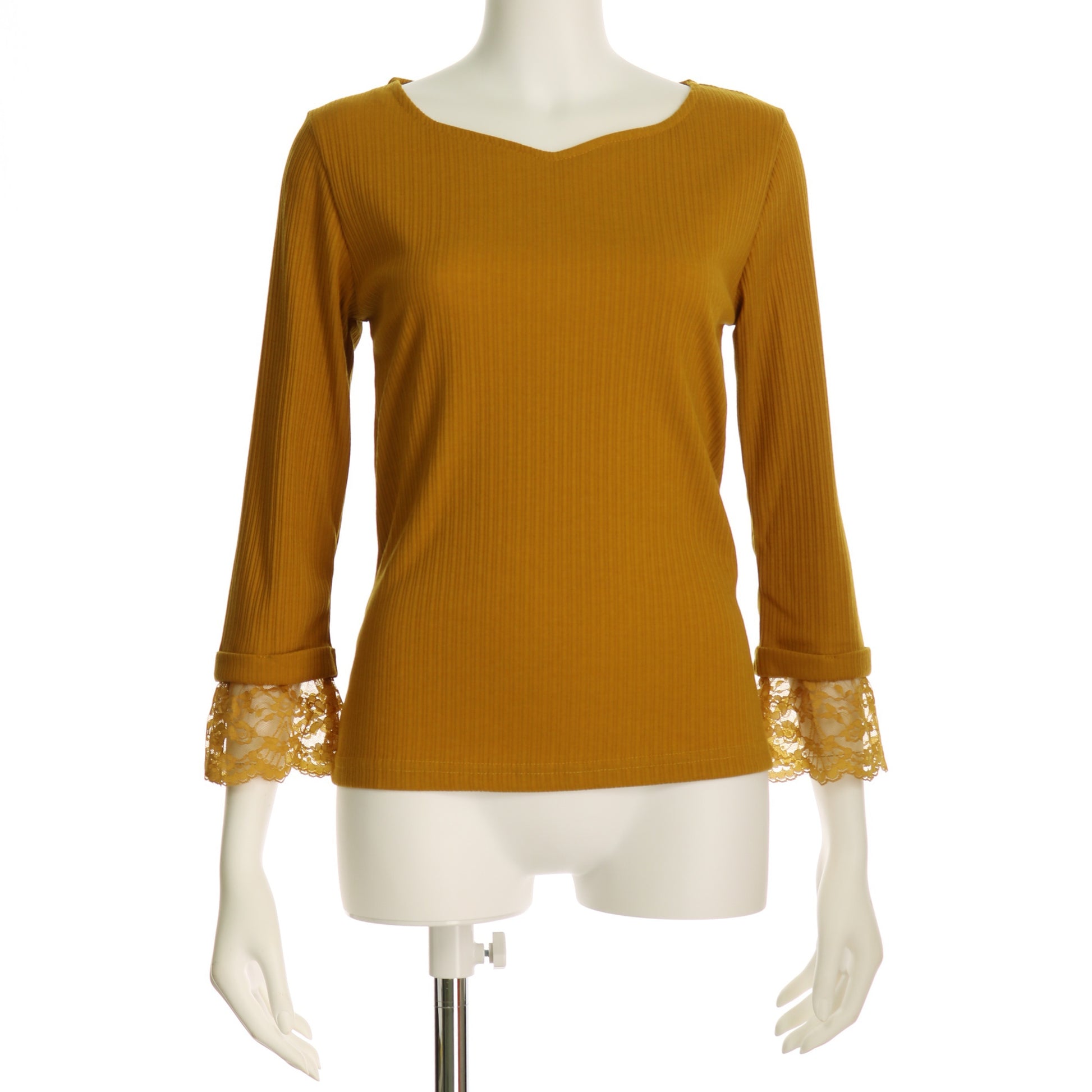 袖口にレース切り替えがあるリブカットソー。フレアスカートを合わせてレディライクに仕上げたり、デニムパンツを合わせてカジュアルにも着こなせますね。