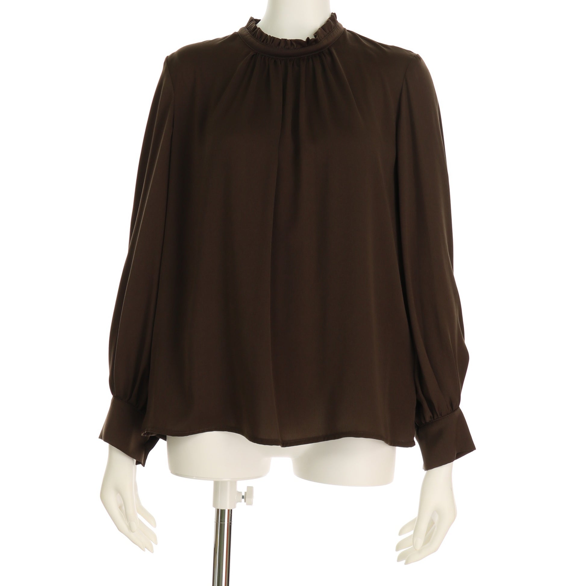 フリルのスタンドカラーがポイントのブラウス。ボトムスには、ワイドパンツを合わせてきれいめカジュアルスタイルに、ペンシルスカートを合わせてレディライクなスタイルにしてもいいですね!