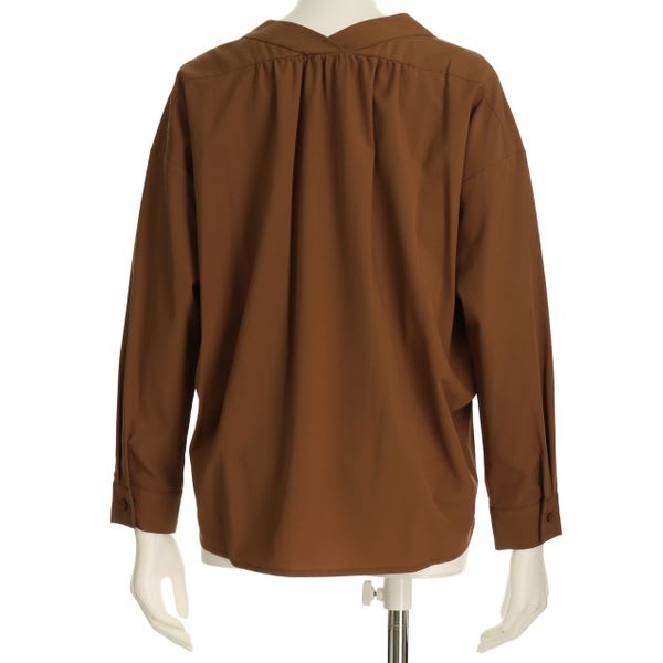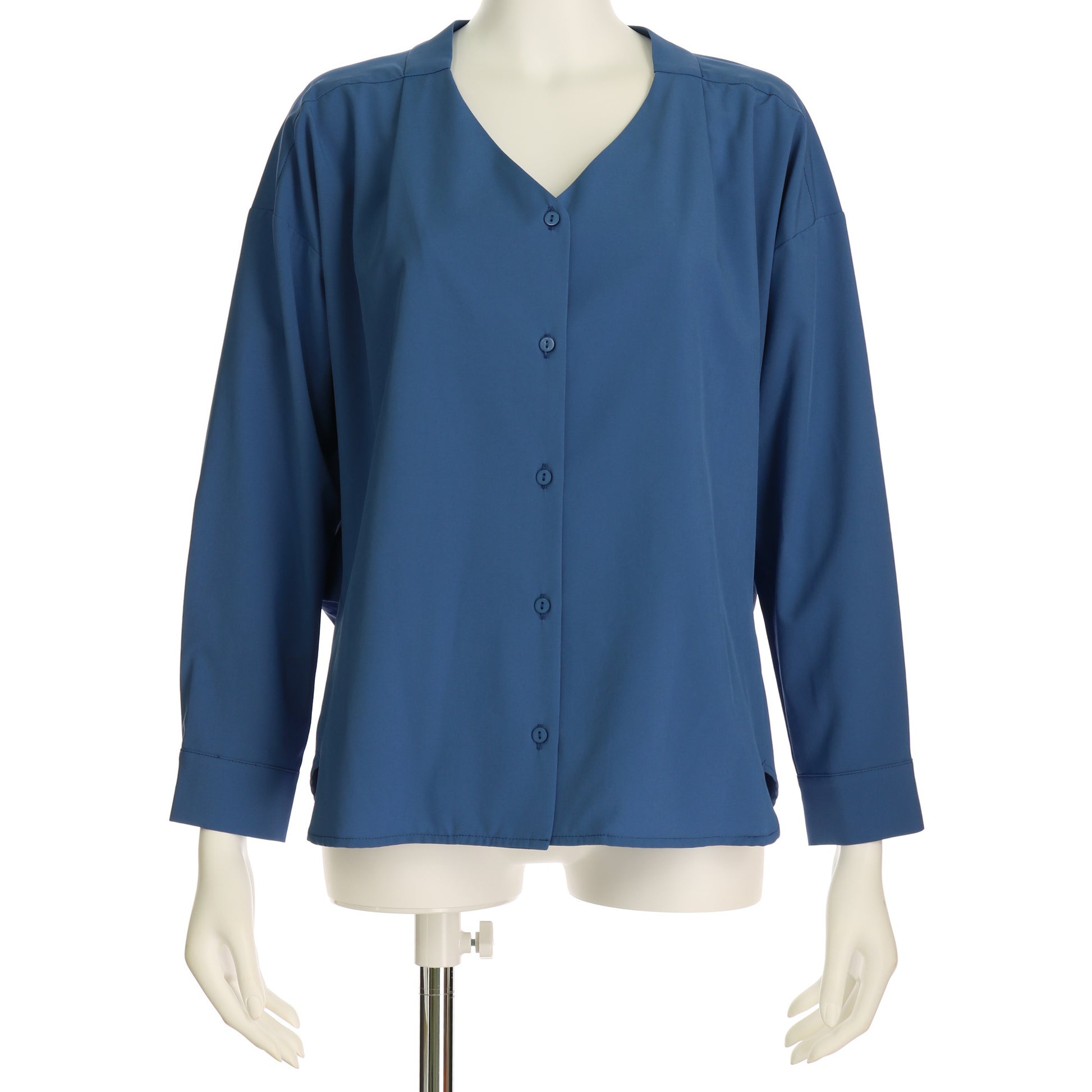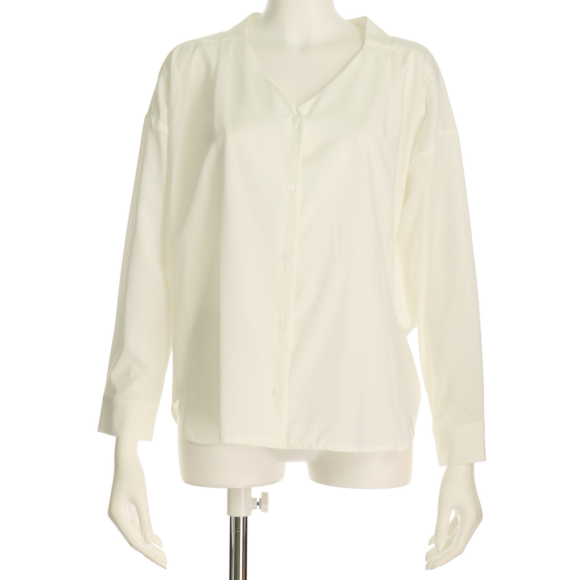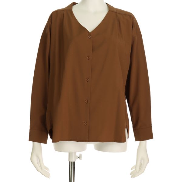 Vネックのフロントボタンブラウス。ボトムスには、ワイドパンツを合わせてカジュアルに、シンプルなタイトスカートを合わせてきれいめにしてもいいですね!