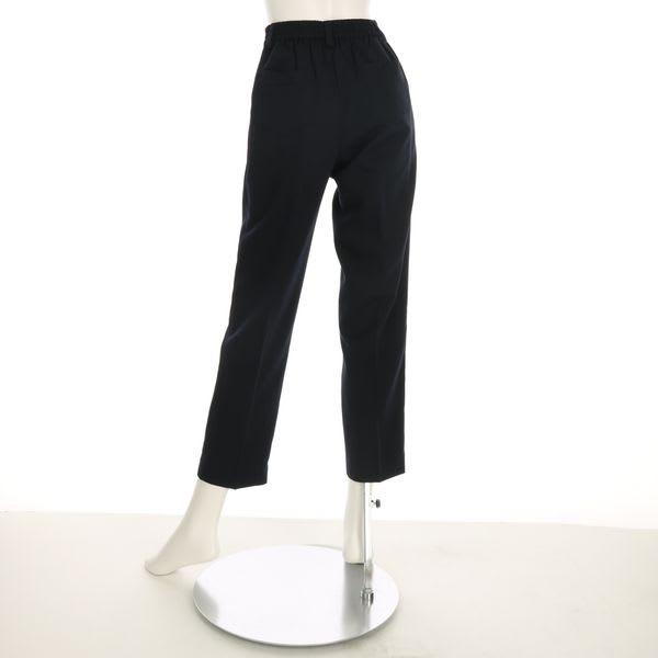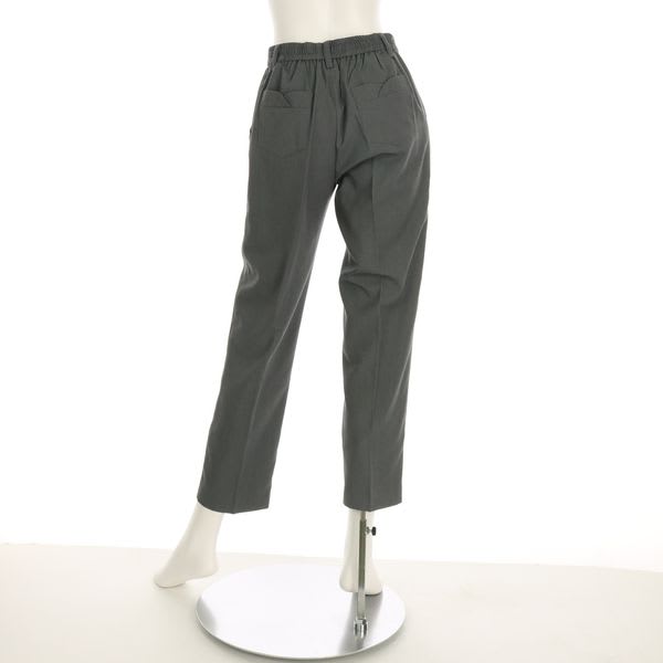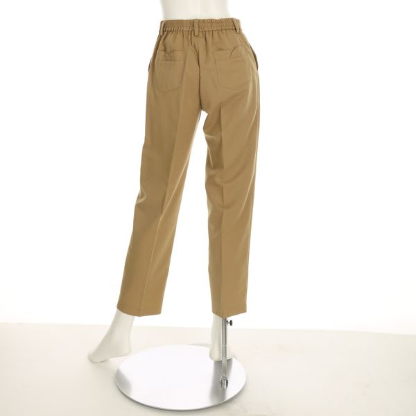 後ろゴムデザインの履きやすいシンプルなテーパードパンツ。Vネックブラウスとポインテッドトゥパンプスを合わせてスッキリ見えスタイルに、カットソーとスニーカーを合わせてカジュアルな着こなしもオススメです。