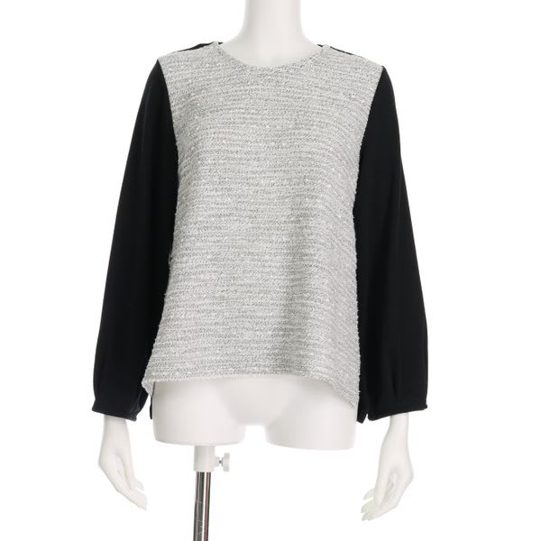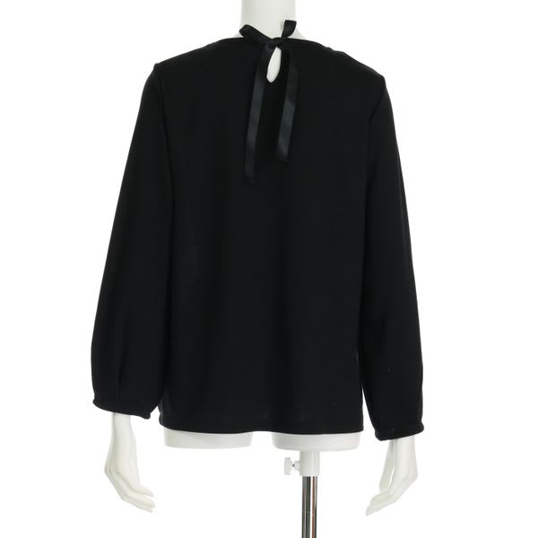 バックリボンがポイントのツイード切り替えのカットソー。テーパードパンツとヒールパンプスを合わせてオフィスカジュアルに、フレアスカートとバレエシューズを合わせてお出かけスタイルもオススメです。