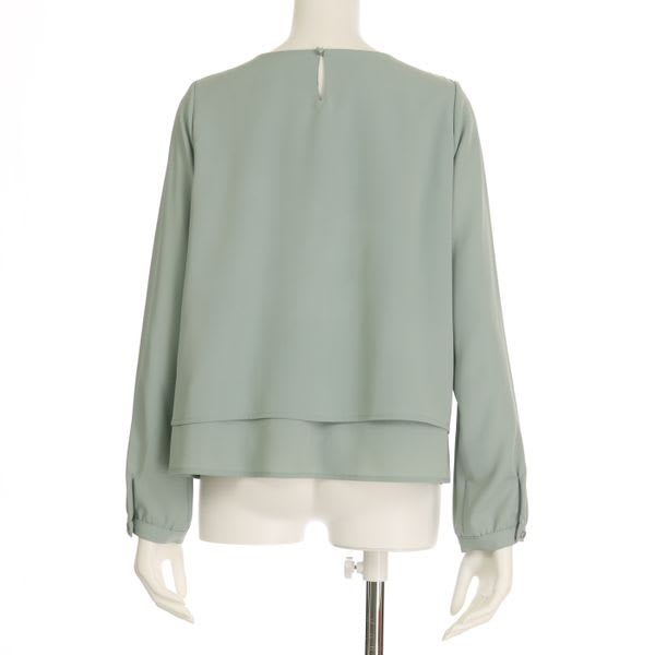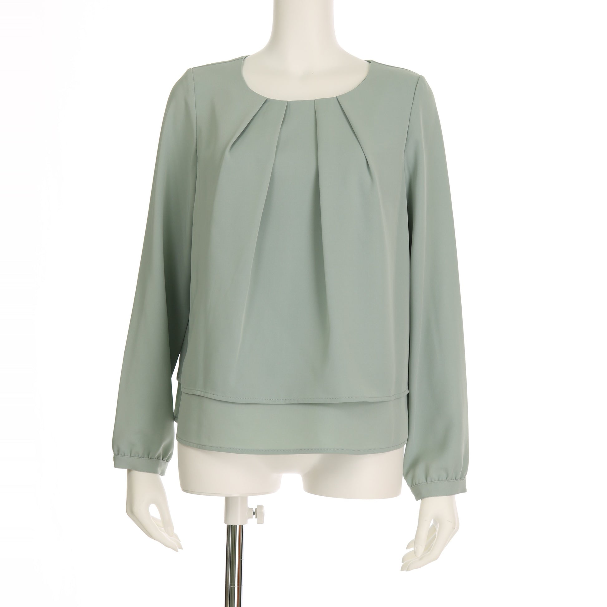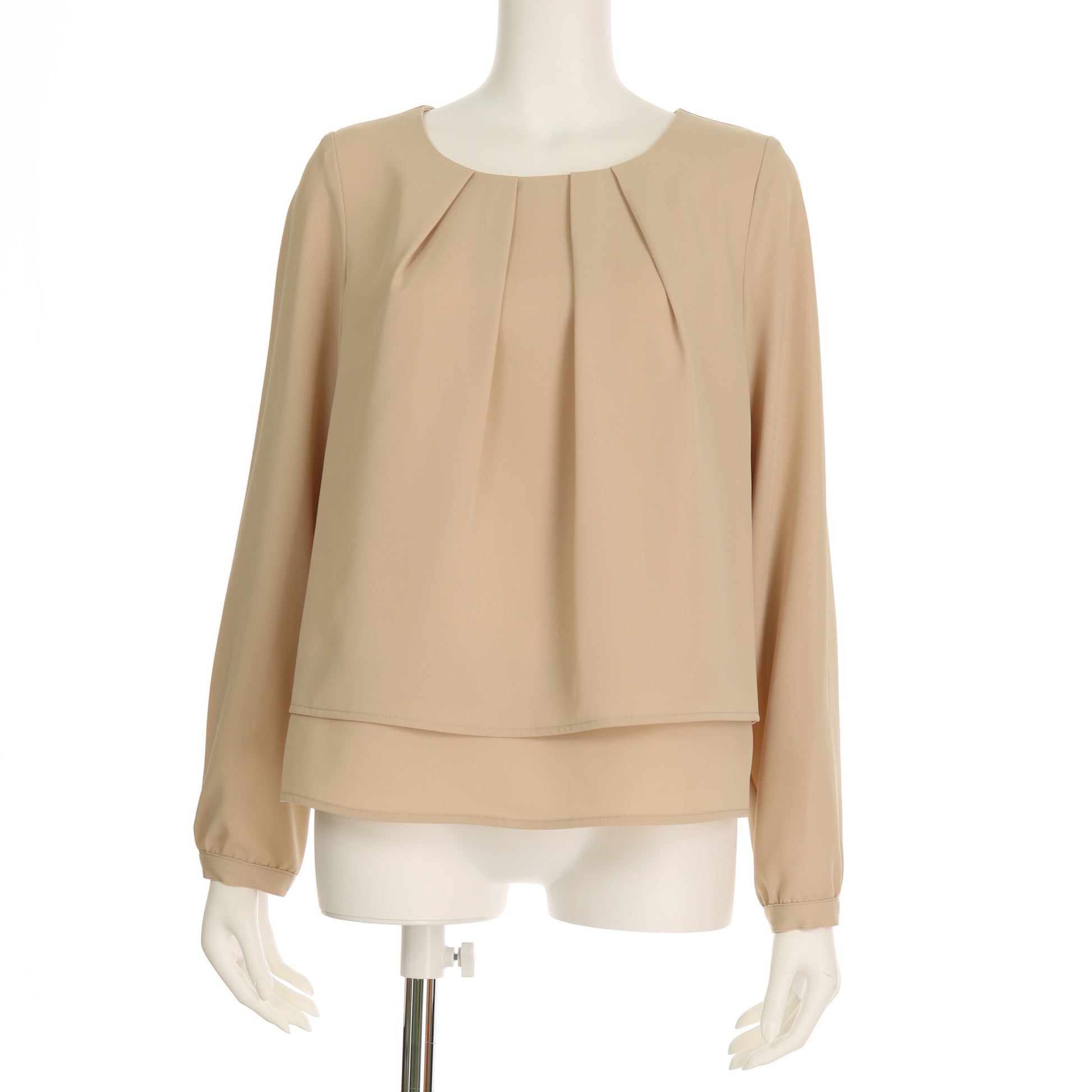 ネックラインに入ったタックや、重ね着風デザインがポイントのブラウス。