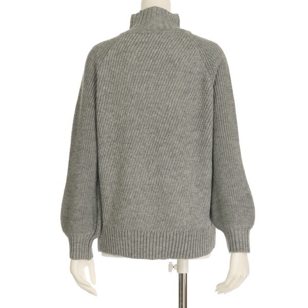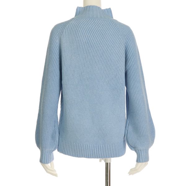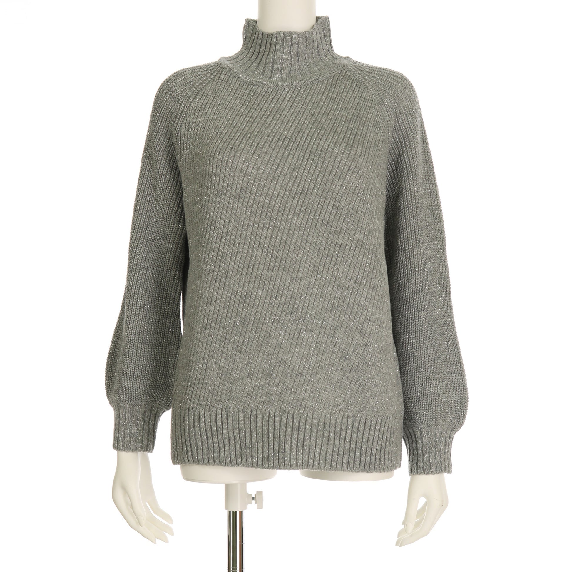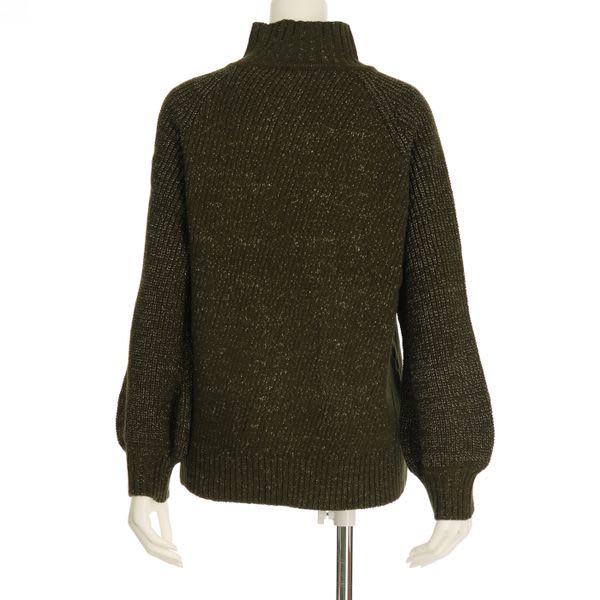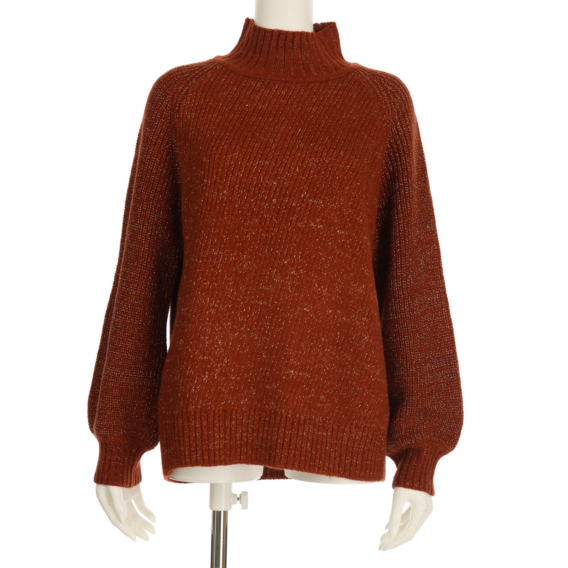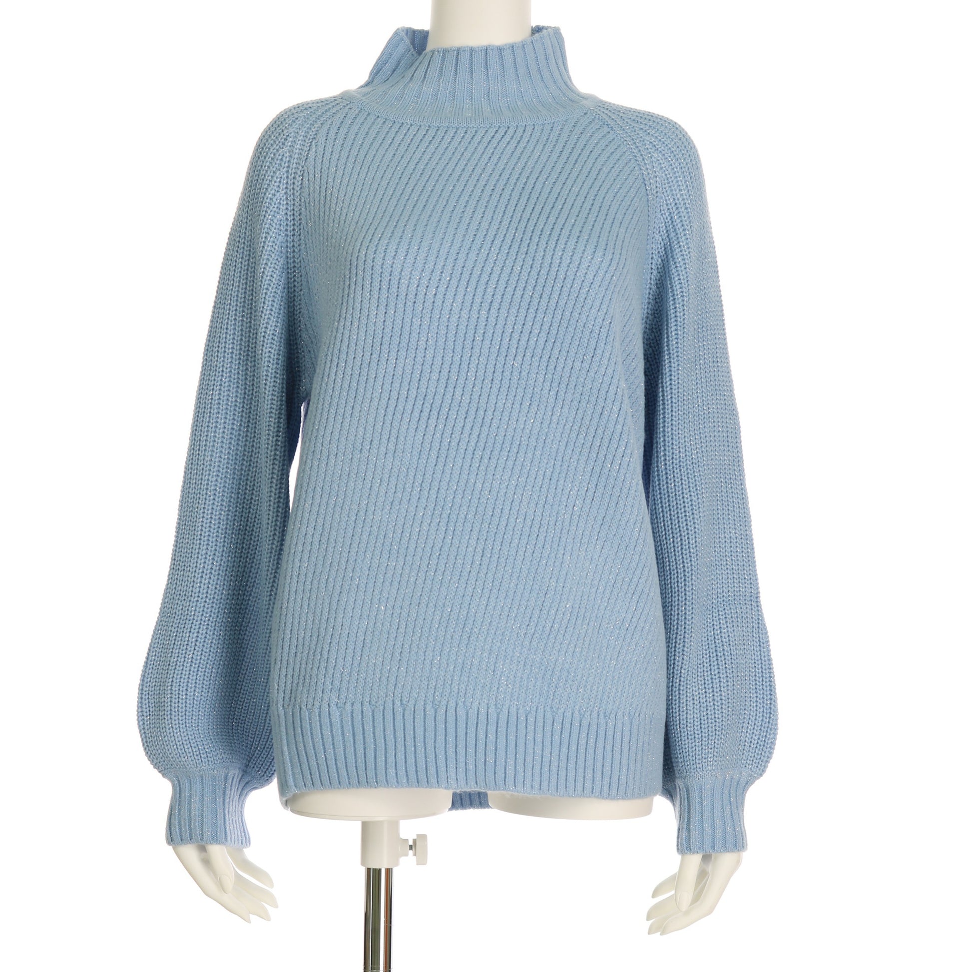 ラメ織のバルーンスリーブのハイネックニット。ラップ風スカートを合わせてレディライクに、カラーパンツを合わせてクールな印象のスタイルにしても◎です。