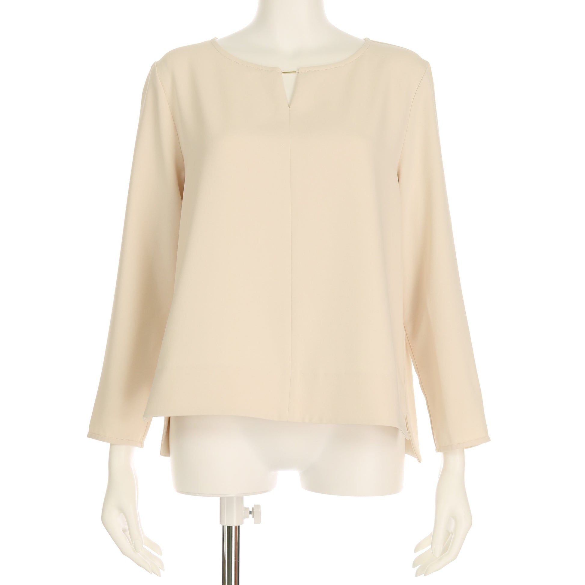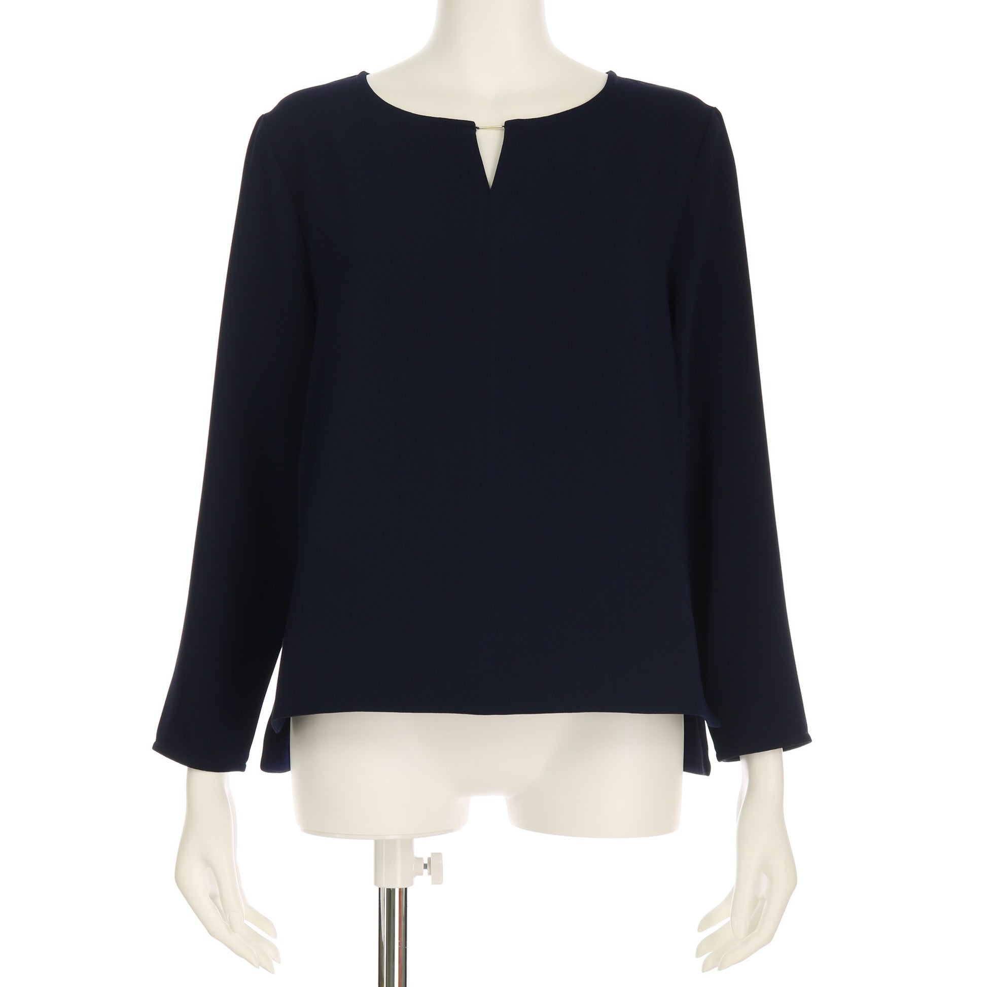 胸元のメタルパーツが上品なオープンフロントネックのブラウス。バックファスナーで着やすいです。台形スカートに合わせて女性らしいオフィススタイルに、ワイドパンツを合わせて綺麗めカジュアルにも着られますね!