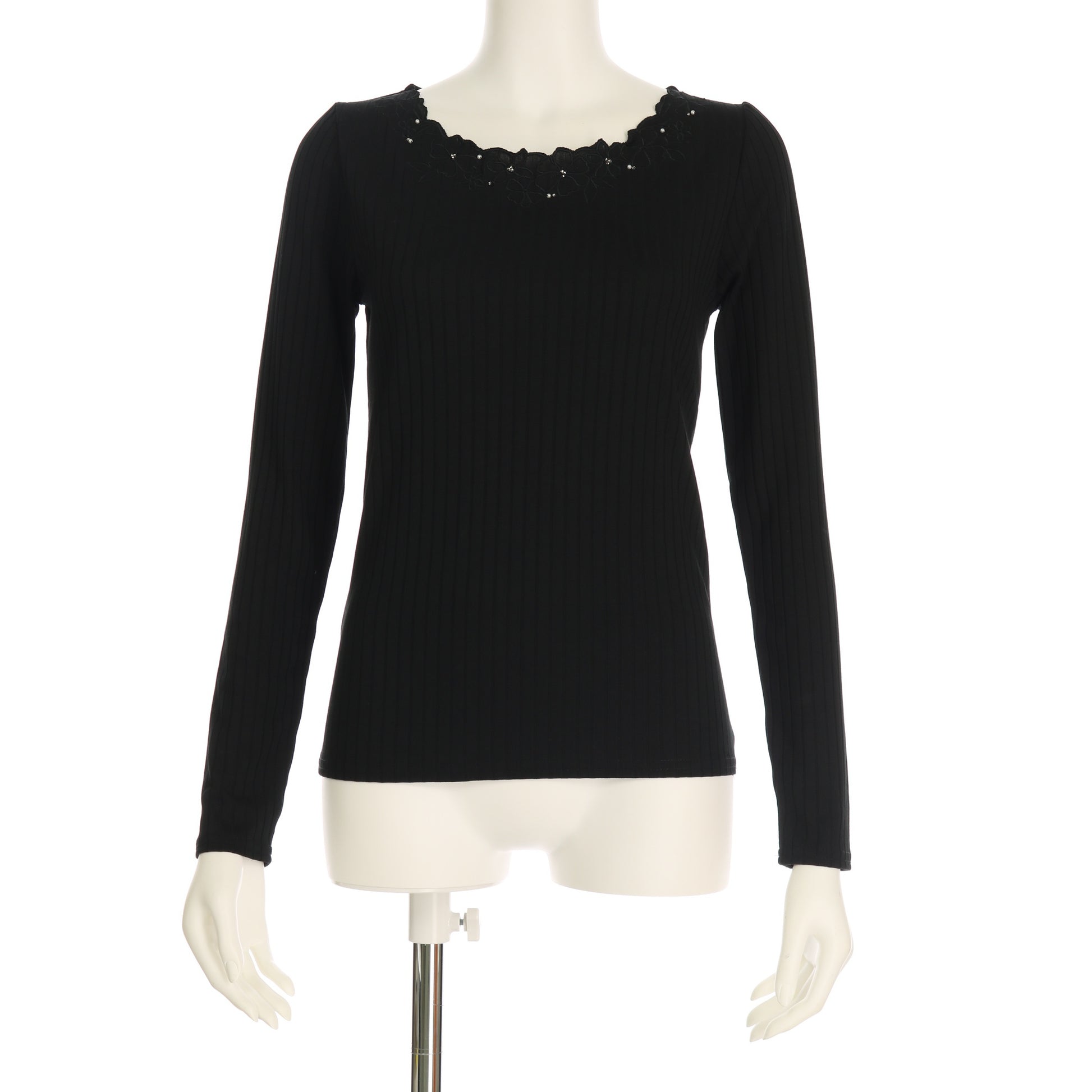 胸元のフラワーモチーフと装飾が女性らしいリブカットソー。フレアスカートを合わせてフェミニンテイストに、テーパードパンツを合わせてすっきりと着るのも◎。ジャケットのインナーにもぴったりですよ!