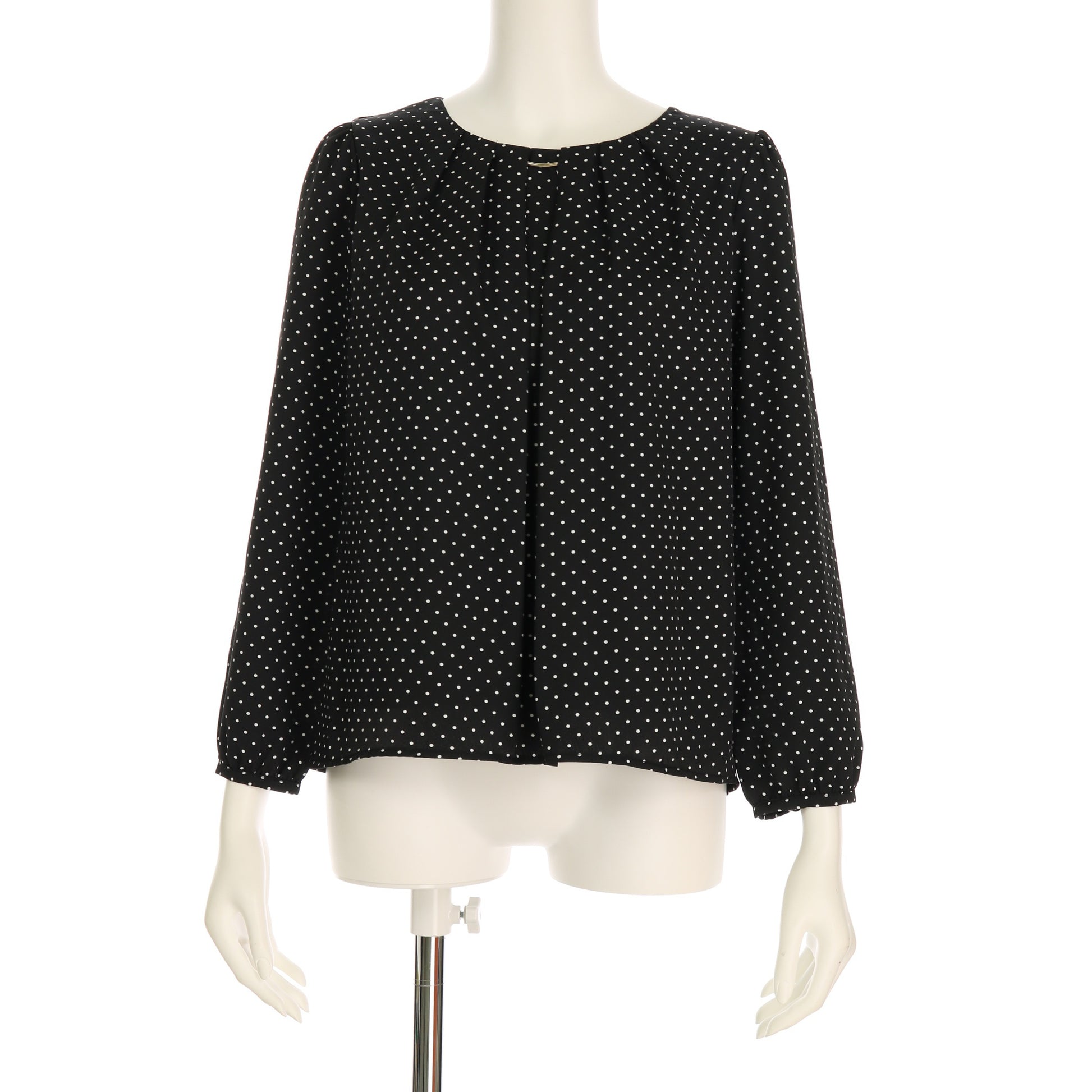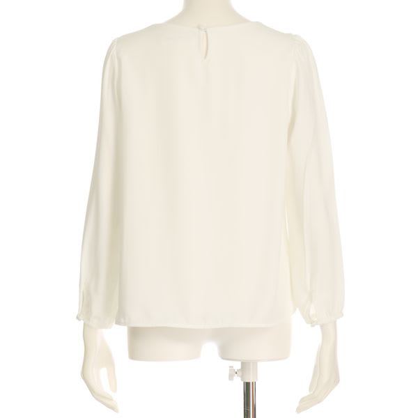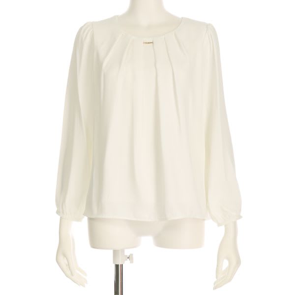 胸元のメタルパーツが上品なブラウス。テーパードパンツを合わせてオフィススタイルに、プリーツスカートに合わせてレディライクに着こなすのもオススメです。