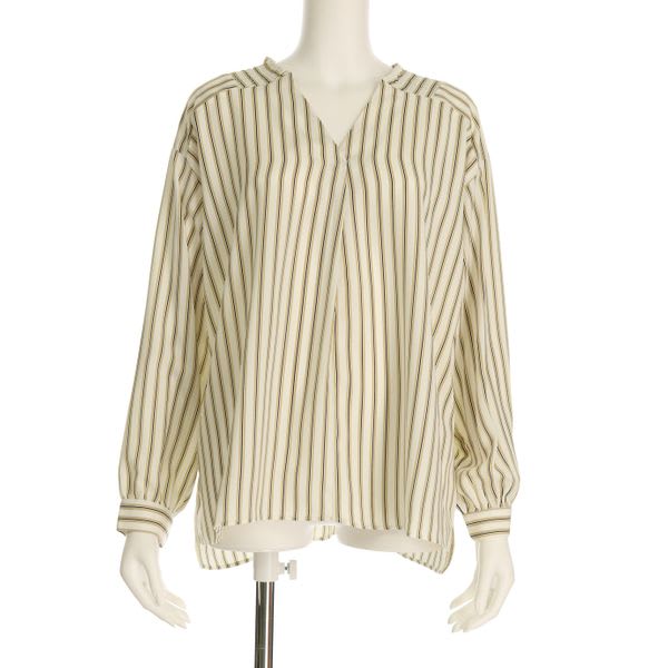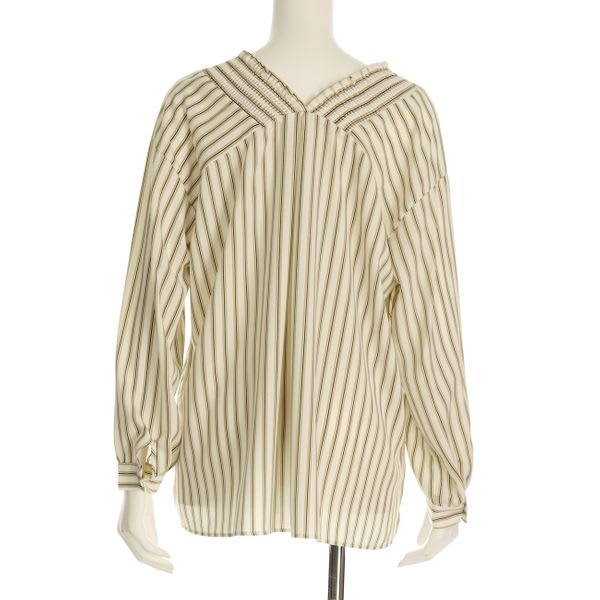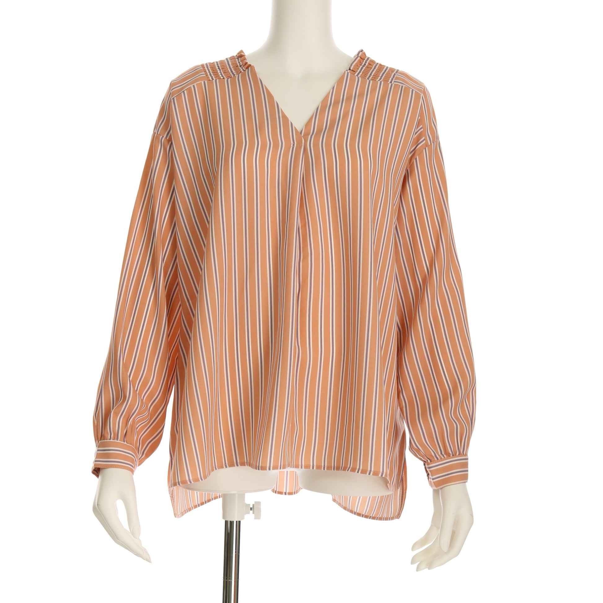襟元のシャーリングがこなれ感のあるスタイルにしてくれるストライプ柄ブラウス。フレアスカートを合わせて女性らしい着こなしに、デニムパンツを合わせてカジュアルな着こなしもステキですよ!