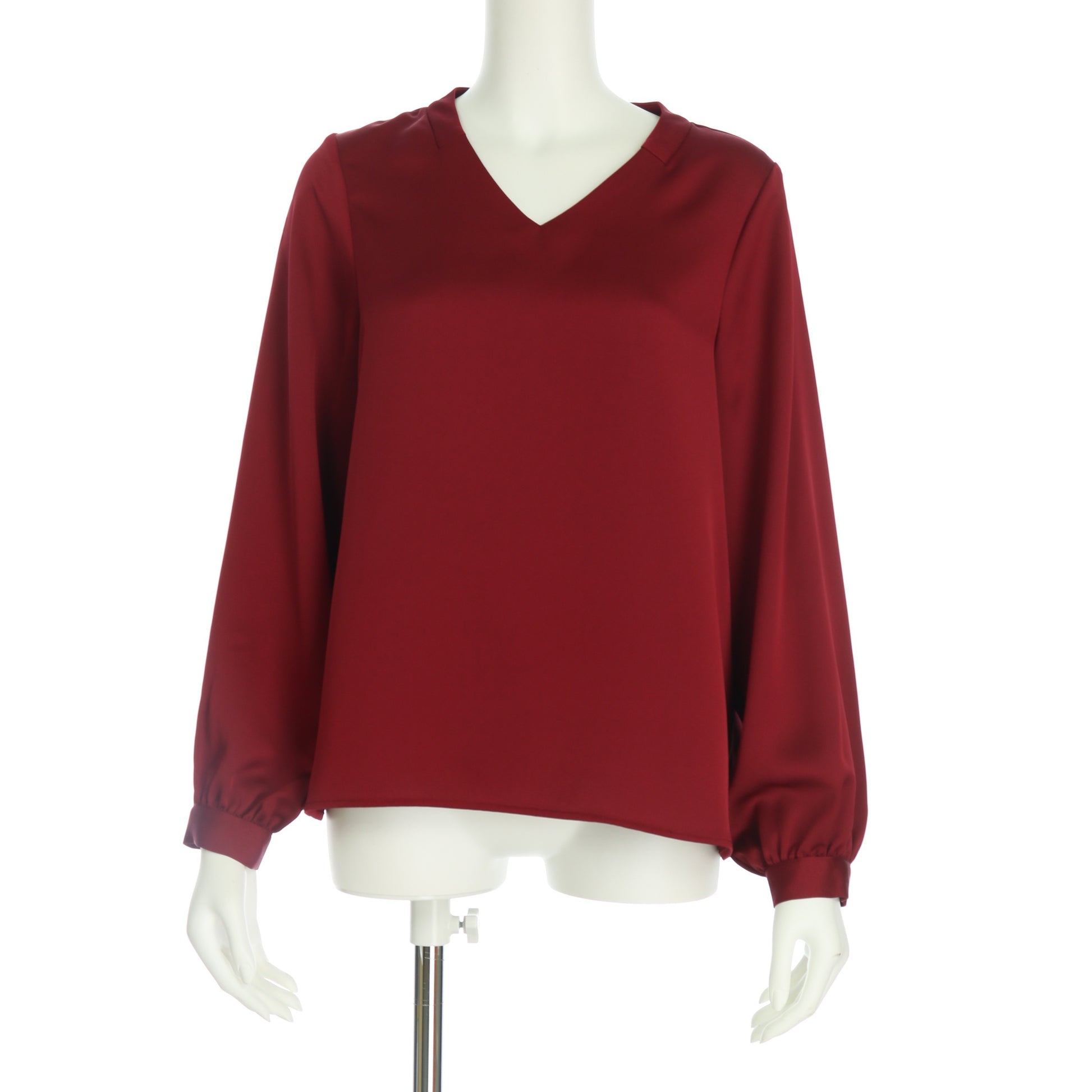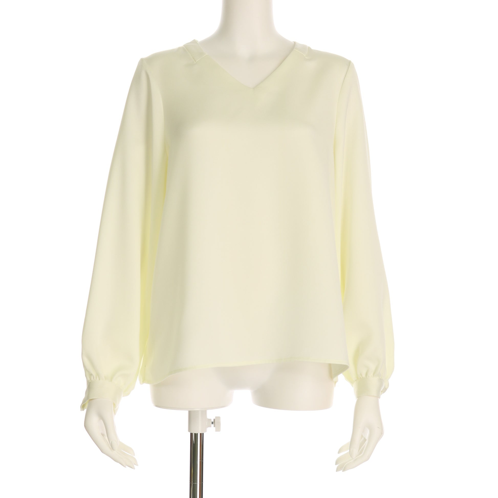 襟元の切り替えがワンポイントのVネックブラウス。テーパードパンツを合わせてマニッシュな着こなしに、タイトスカートを合わせてオフィススタイルに仕上げるのも素敵です。