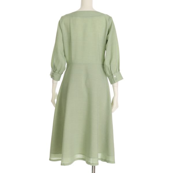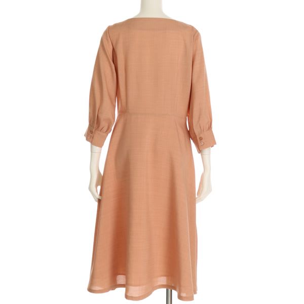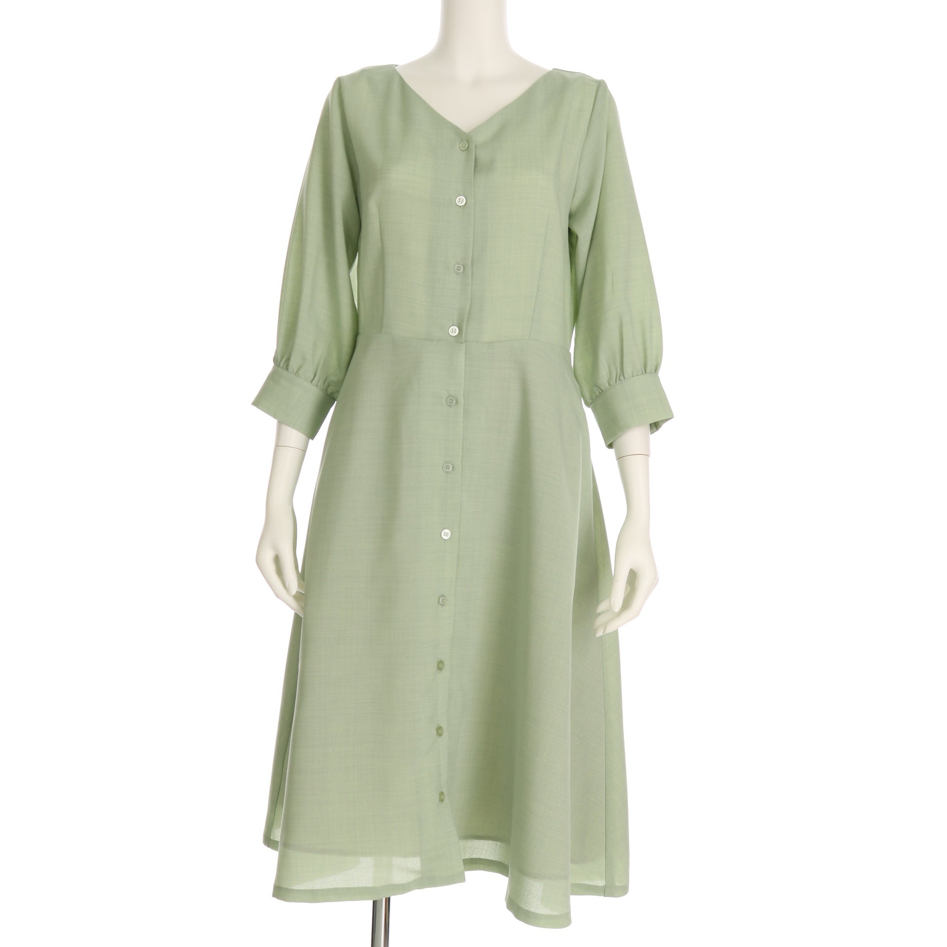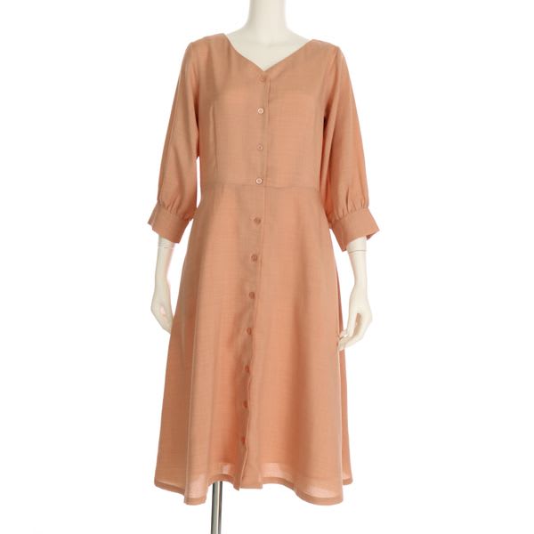 フロントボタンのVネックワンピース。ラウンドトゥのパンプスを合わせて女性らしい雰囲気に、スニーカーを合わせてカジュアルに着こなすのも◎。