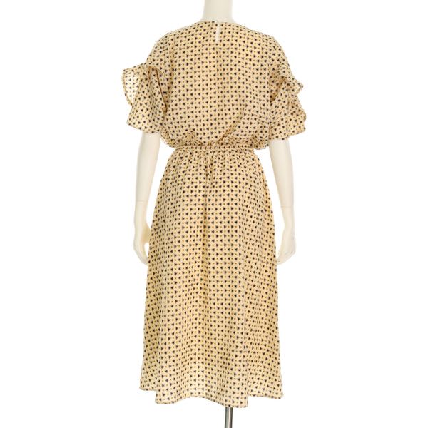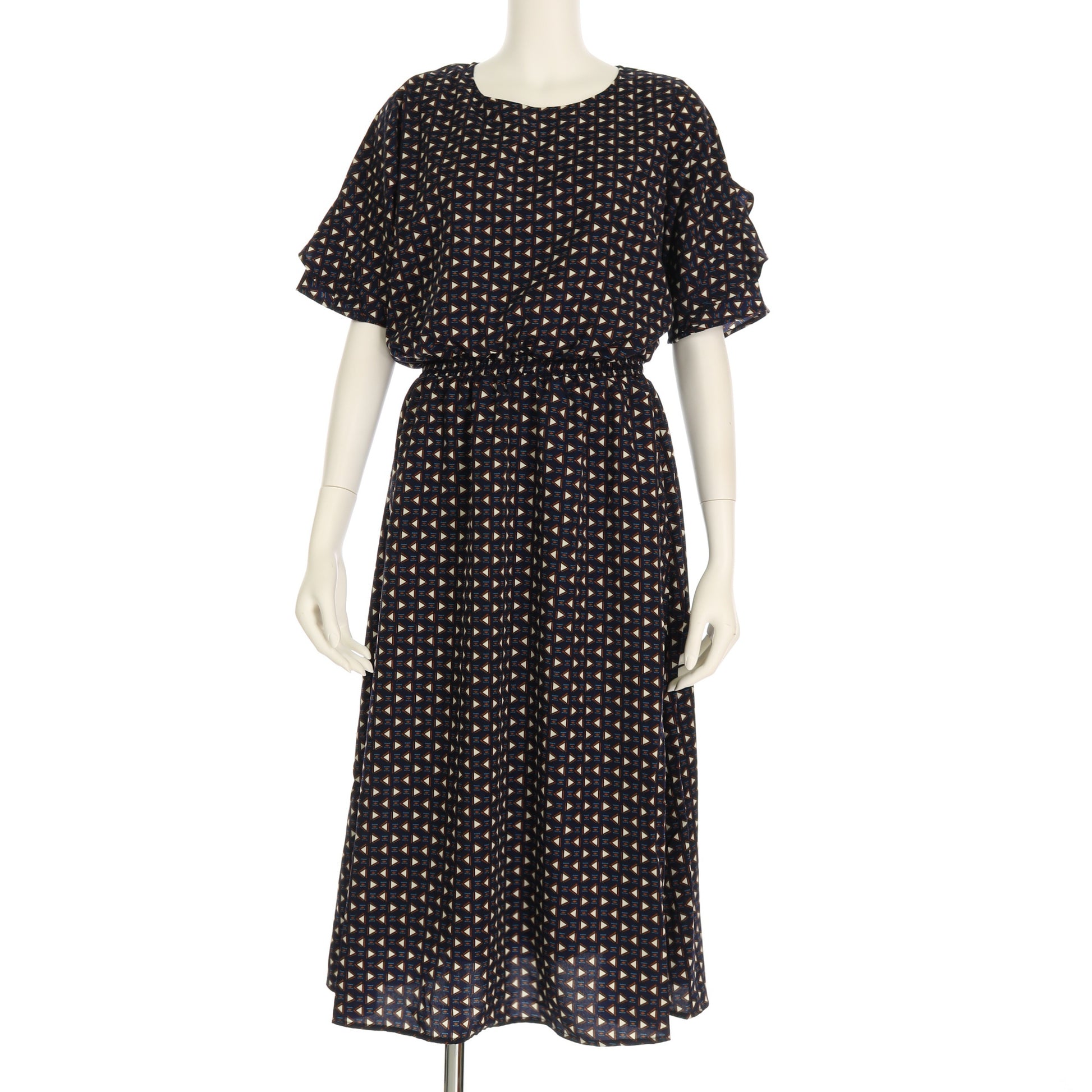 幾何学柄のワンピース。オックスフォードシューズを合わせてクラシカルに、ストラップ付きパンプスでキレイめに仕上げるのも◎。
