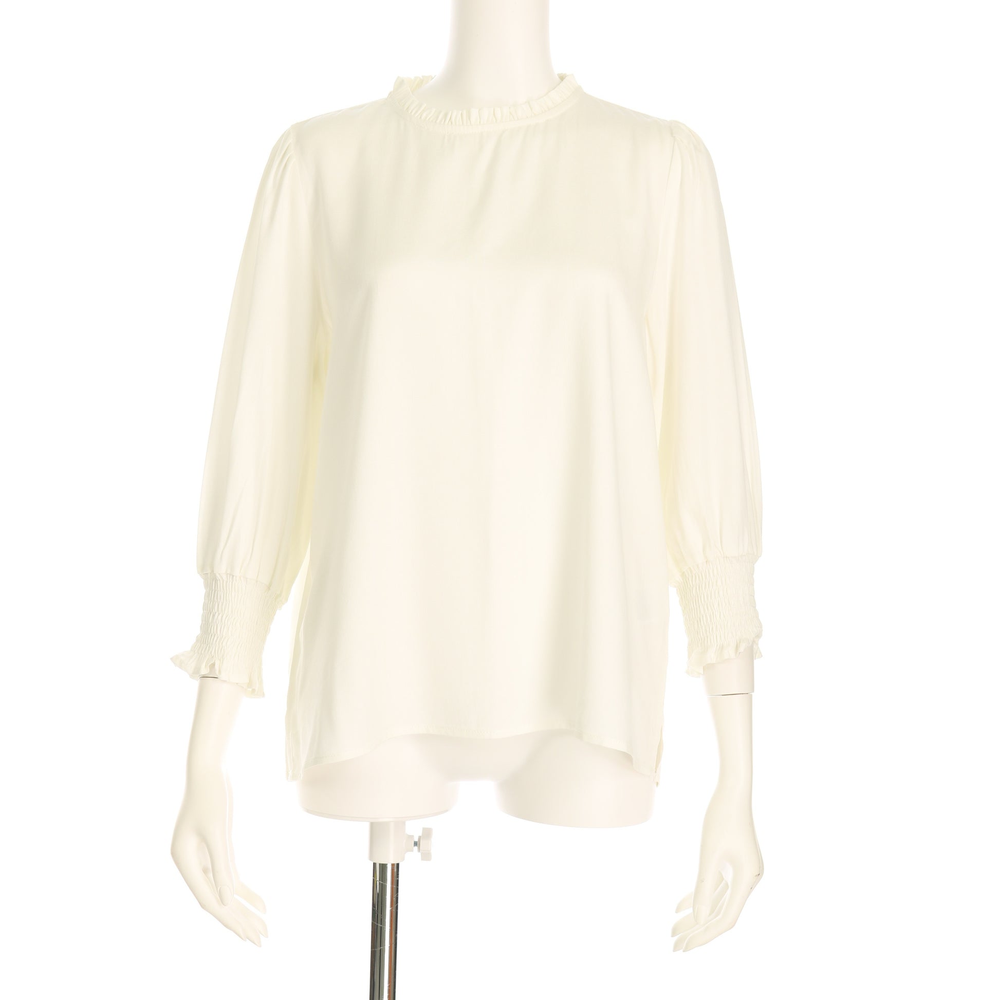 袖口のシャーリングがポイントのブラウス。襟元のフリルが女性らしいですね♪デニムパンツに合わせてカジュアルに、フレアスカートに合わせて上品に着こなしても素敵ですよ。