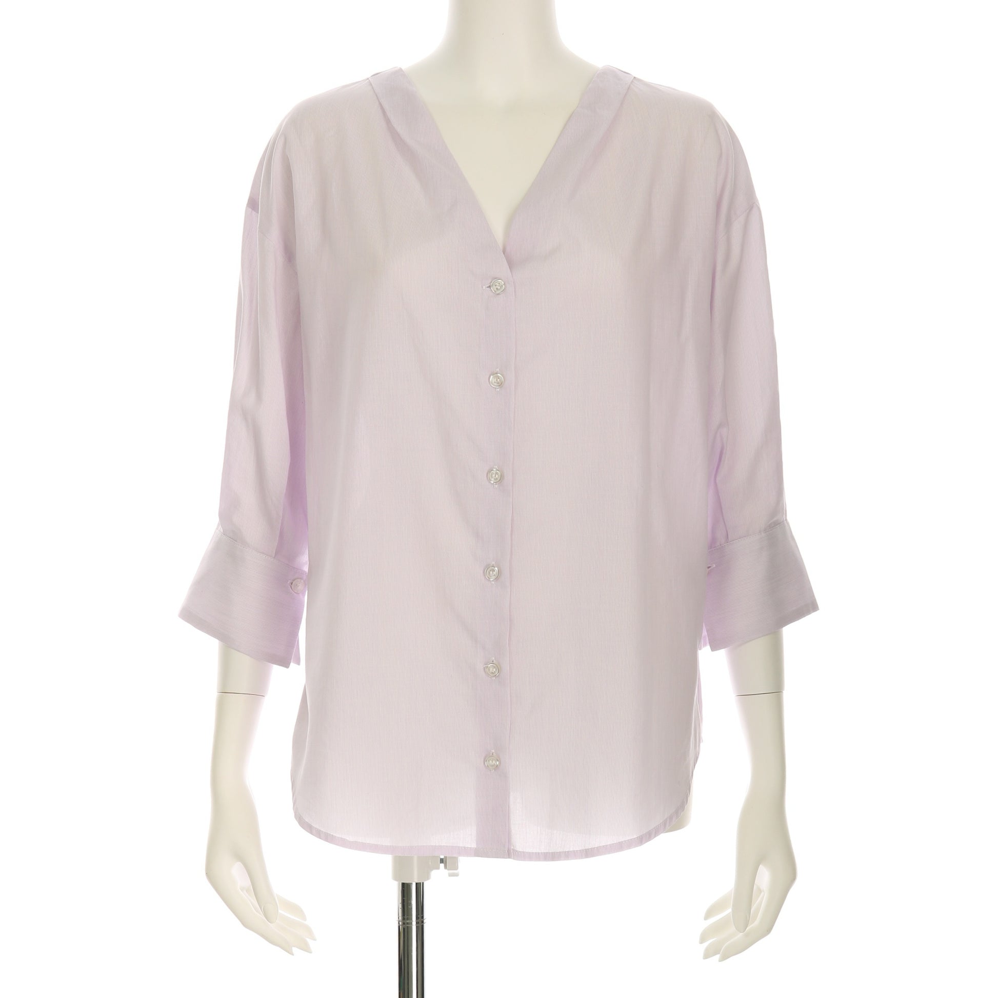 フロントボタンの極細ストライプ柄ブラウス。台形スカートを合わせてオフィスカジュアルに着たり、デニムパンツを合わせて休日スタイルに着るのも◎。