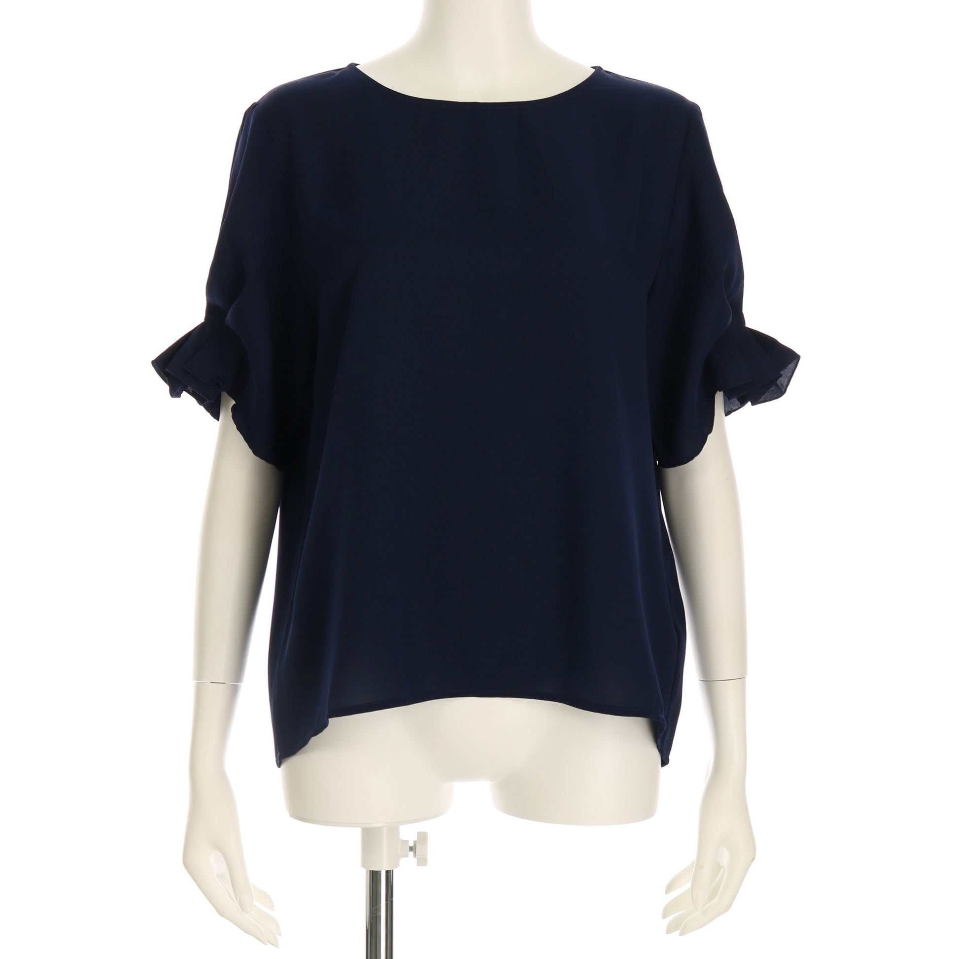 「仕事もプライベートもたくさん着ました。紺の服は比較的多く持っていますが、袖の部分が持ってないタイプなので嬉しかったです。袖はふりふりしてますが生地が薄いのでカーディガンを羽織ってもモコモコしない点もよかった。手持ちの服とも合わせやすくていろいろ合わせて着られました。」