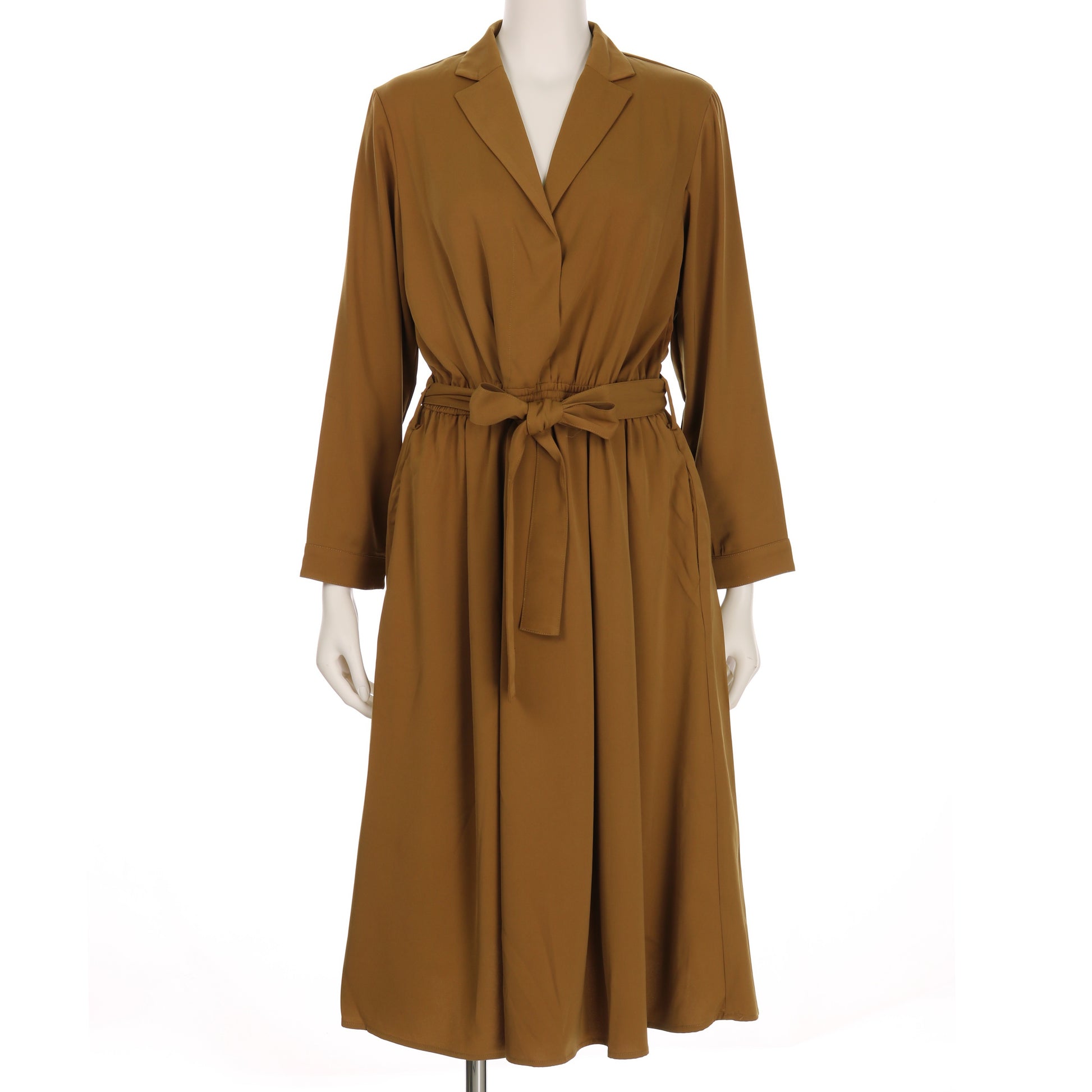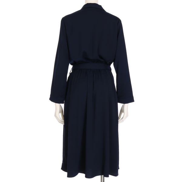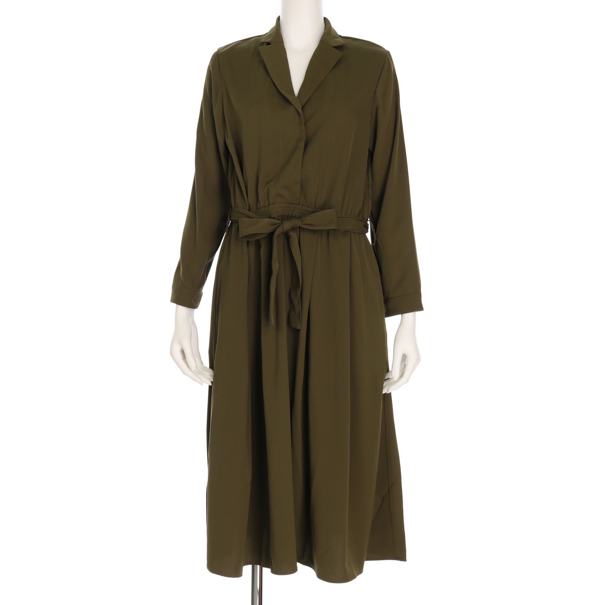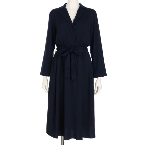 オープンカラーのリボンベルト付きワンピース。インナーに白や黒、同系色のキャミソールなどを着ていただくデザインですよ。ヒールパンプスを合わせてきちんと感のある着こなしに、レースアップシューズでクールな雰囲気を出すのもいいですね。