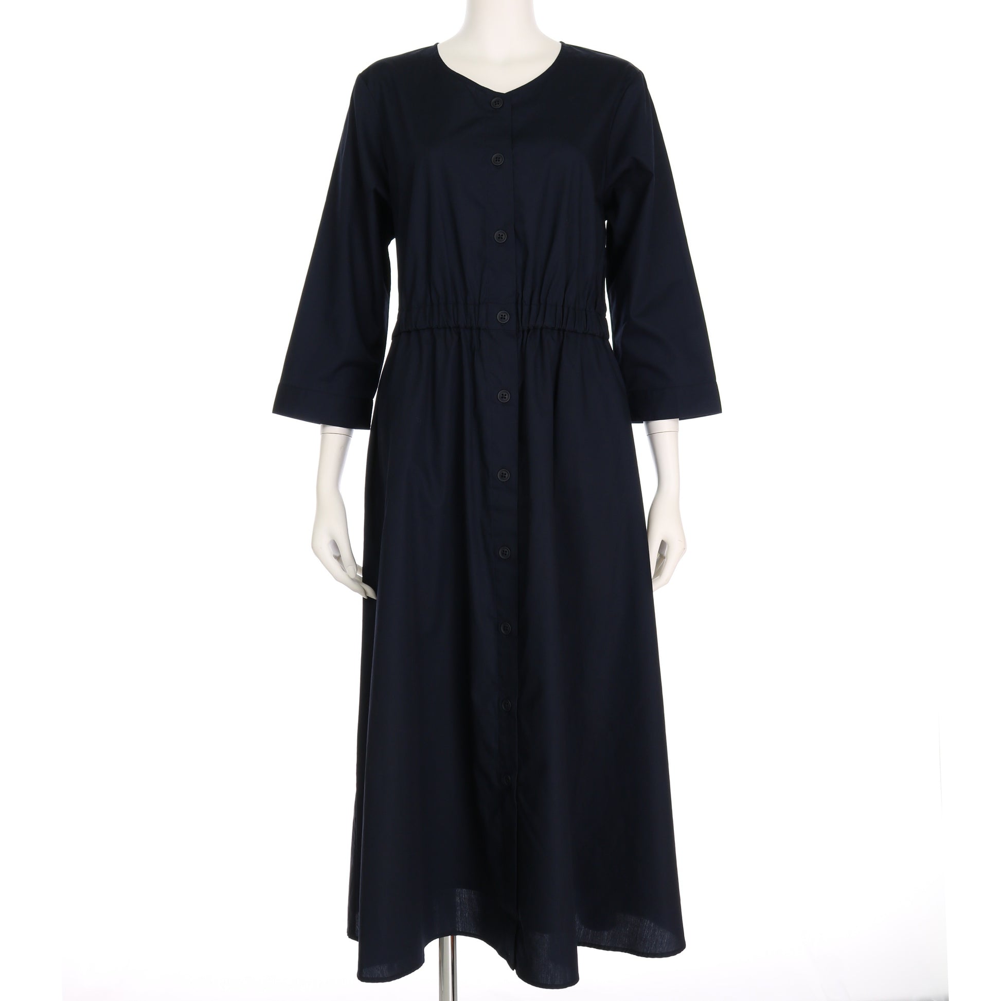 ウエストゴム入りフロントボタンのワンピース。華奢なネックレスとヒールパンプスを合わせて女性らしいスタイルに、レギンスとスニーカーを合わせてカジュアルスタイルも素敵です。