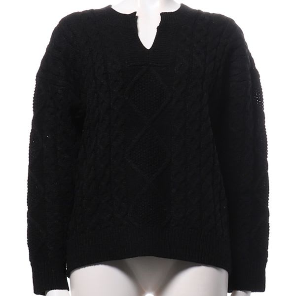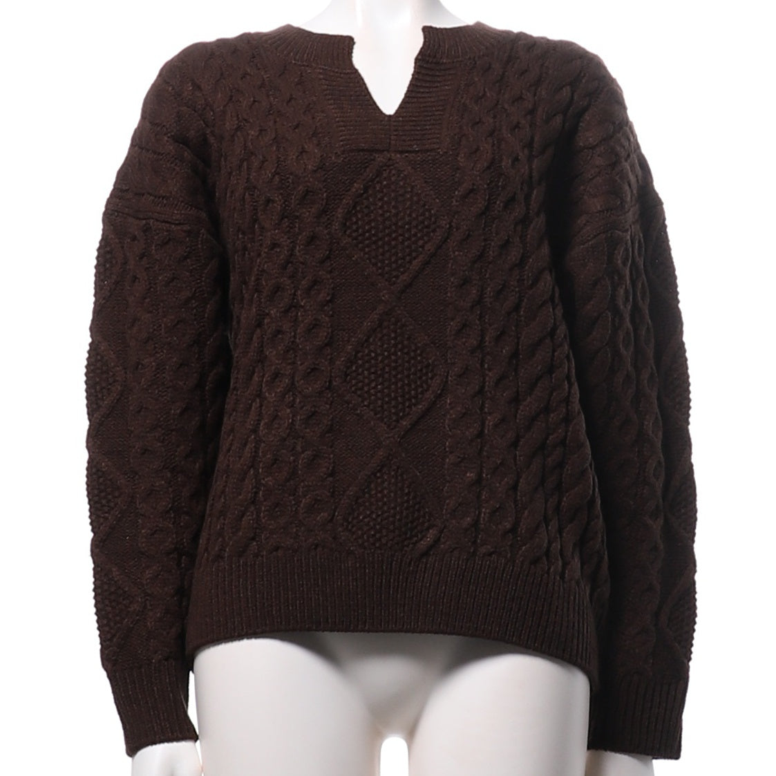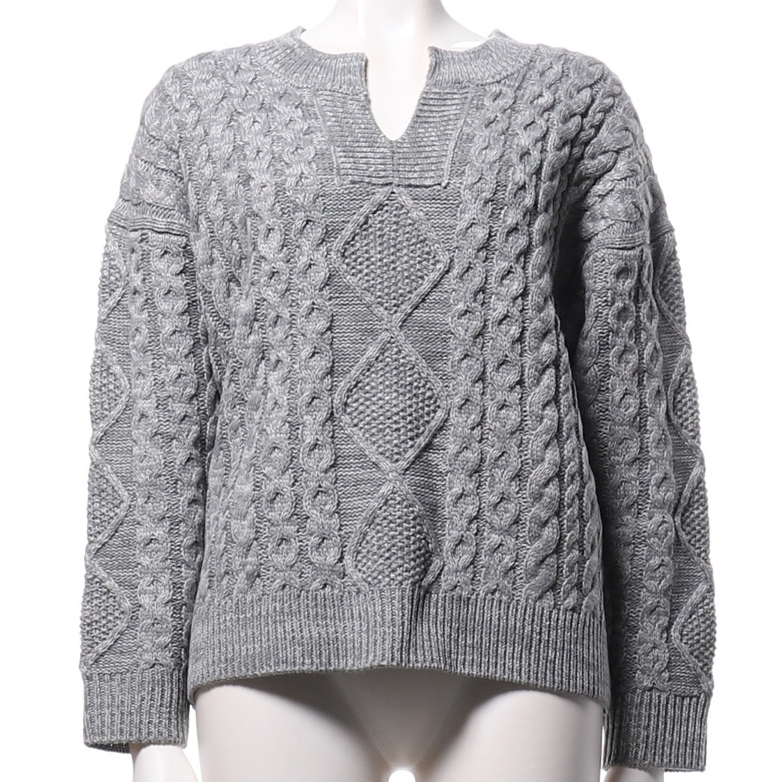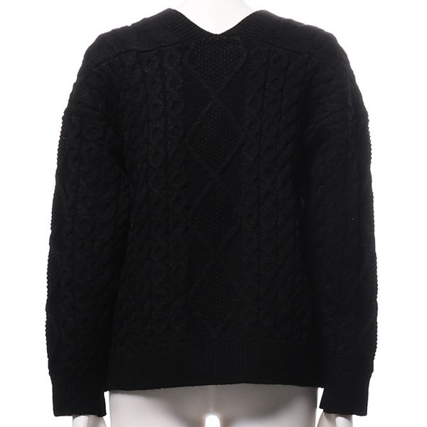 オープンフロントネックのケーブル編みニットです。デニムパンツを合わせてカジュアルなスタイルや、フレアスカートを合わせて女性らしい着こなしもいいですね。