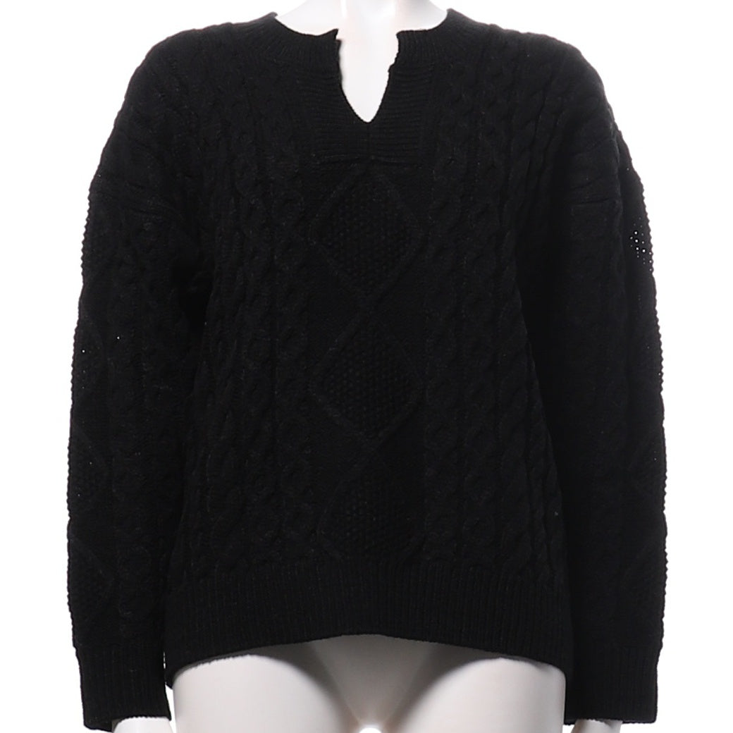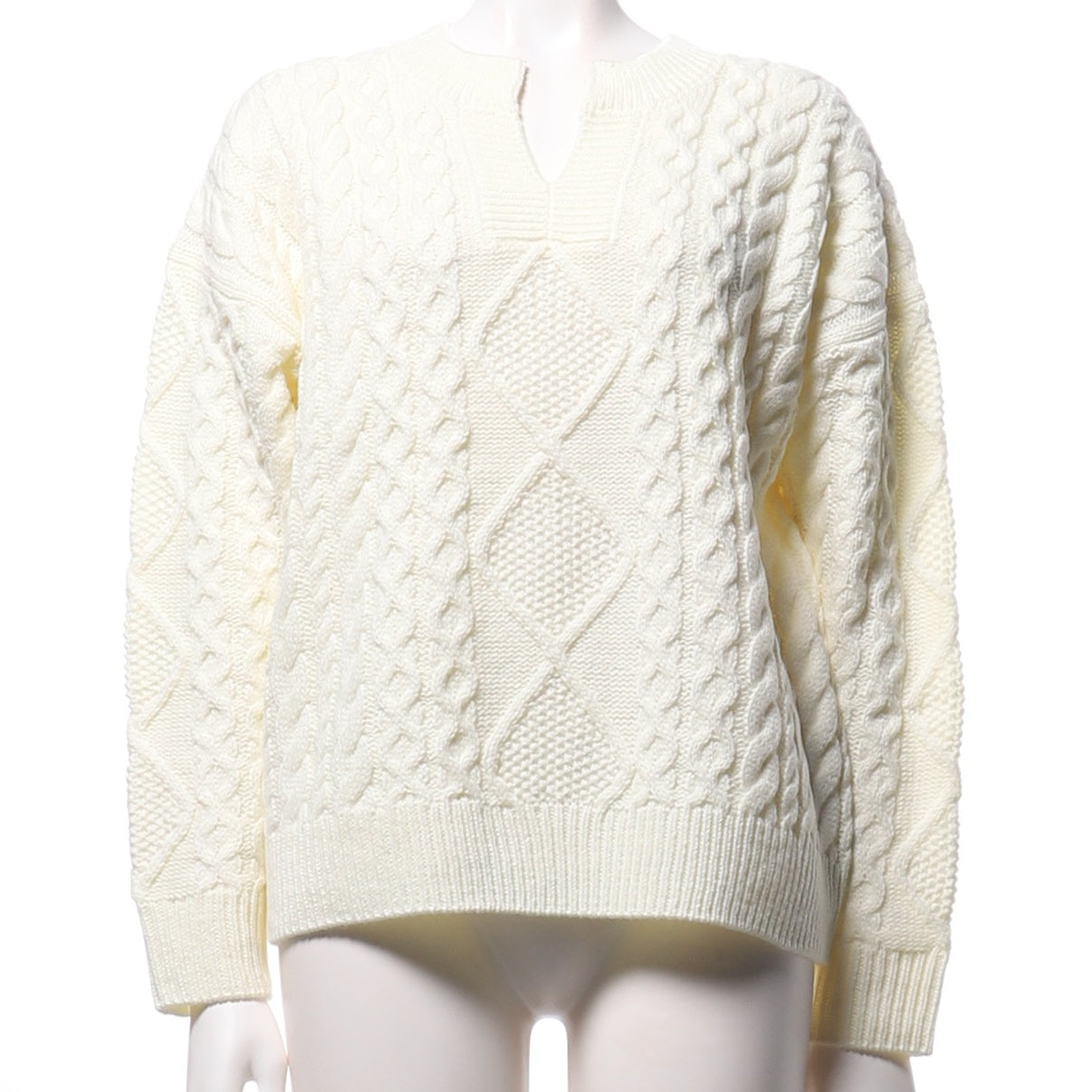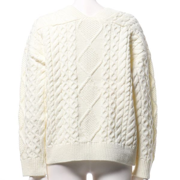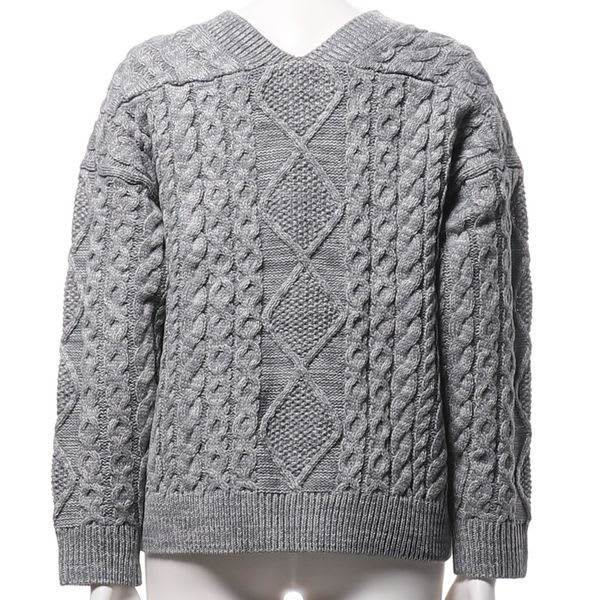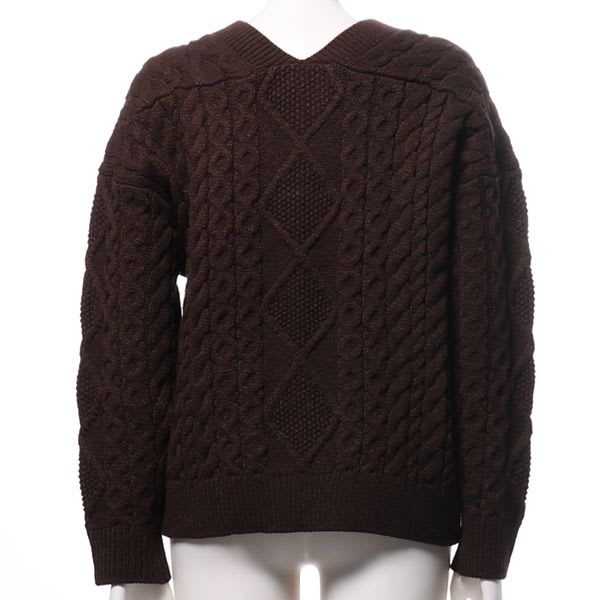 オープンフロントネックのケーブル編みニットです。デニムパンツを合わせてカジュアルなスタイルや、フレアスカートを合わせて女性らしい着こなしもいいですね。