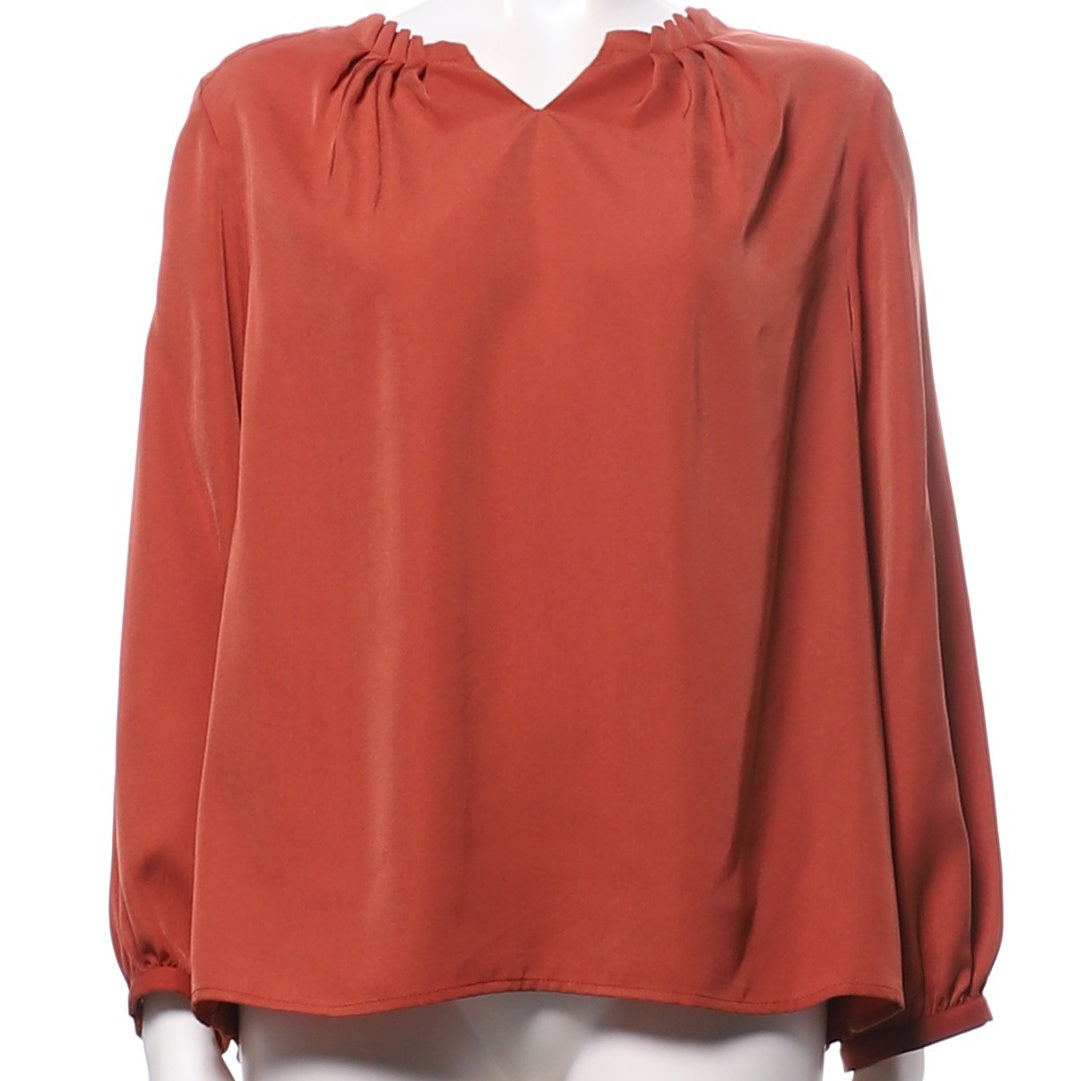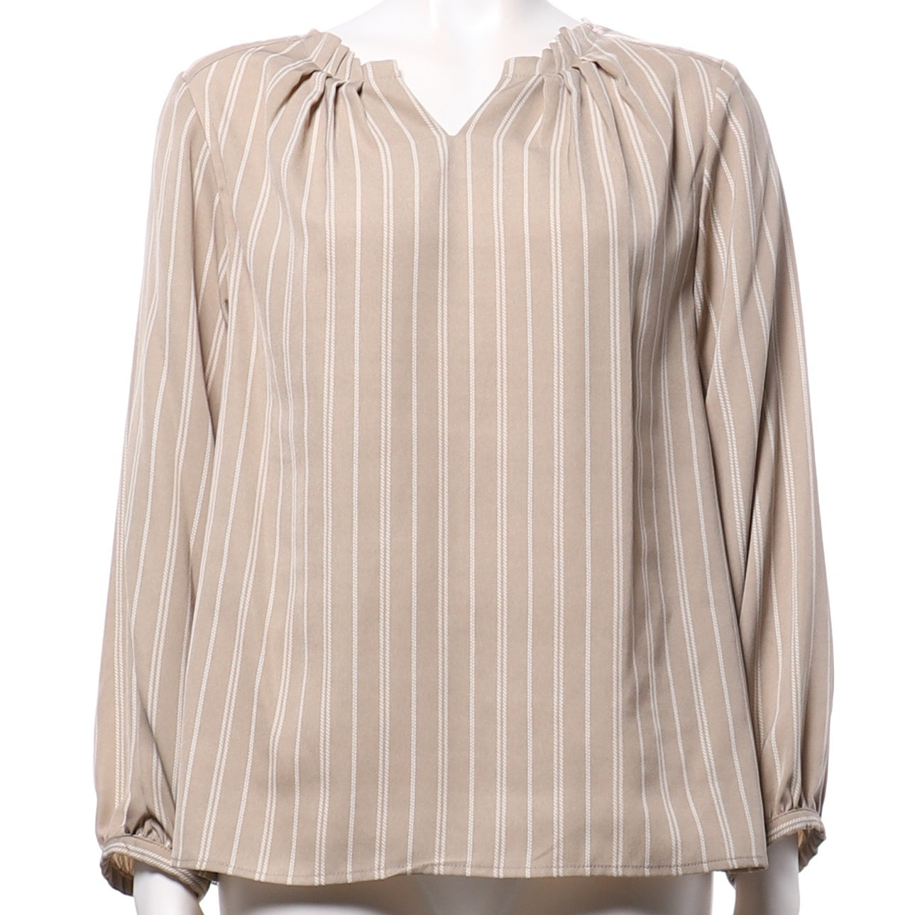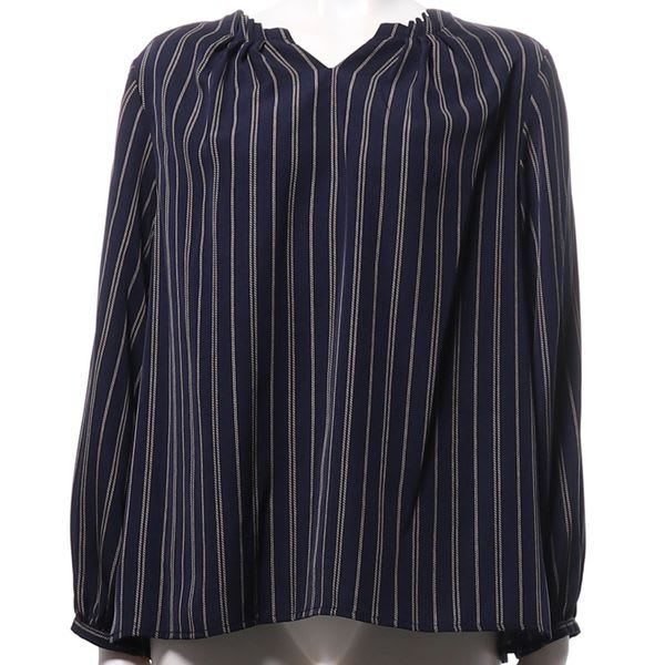 ギャザーデザインがポイントのオープンフロントネックブラウス。フレアスカートに合わせてレディライクなスタイルに、テーパードパンツに合わせてきれいめカジュアルスタイルも素敵ですよ◎