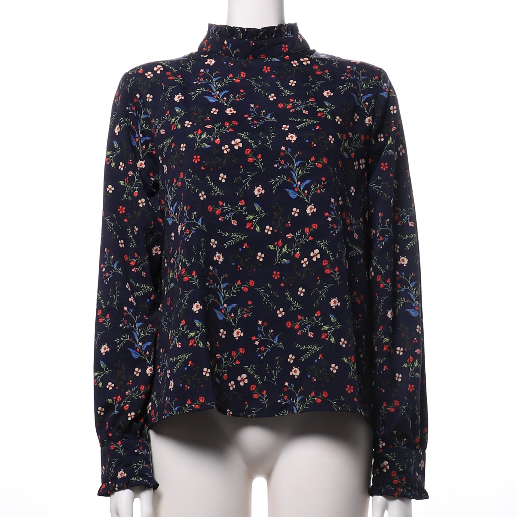 フリルスタンドカラーの花柄ブラウスです。フレアスカートとラウンドトゥパンプスを合わせてフェミニンな着こなしや、テーパードパンツとフラットパンプスを合わせて甘さを抑えたカジュアルな着こなしもいいですね。