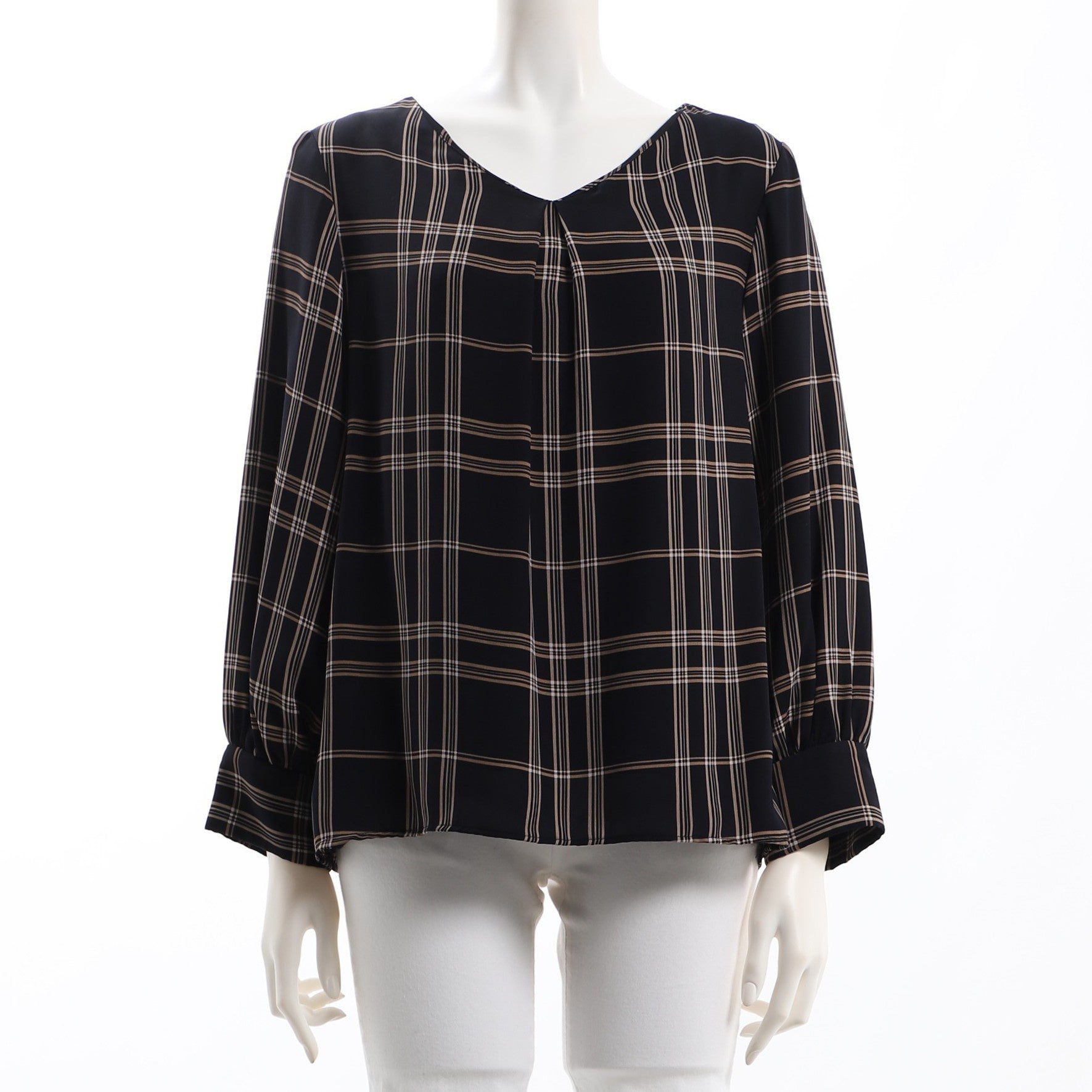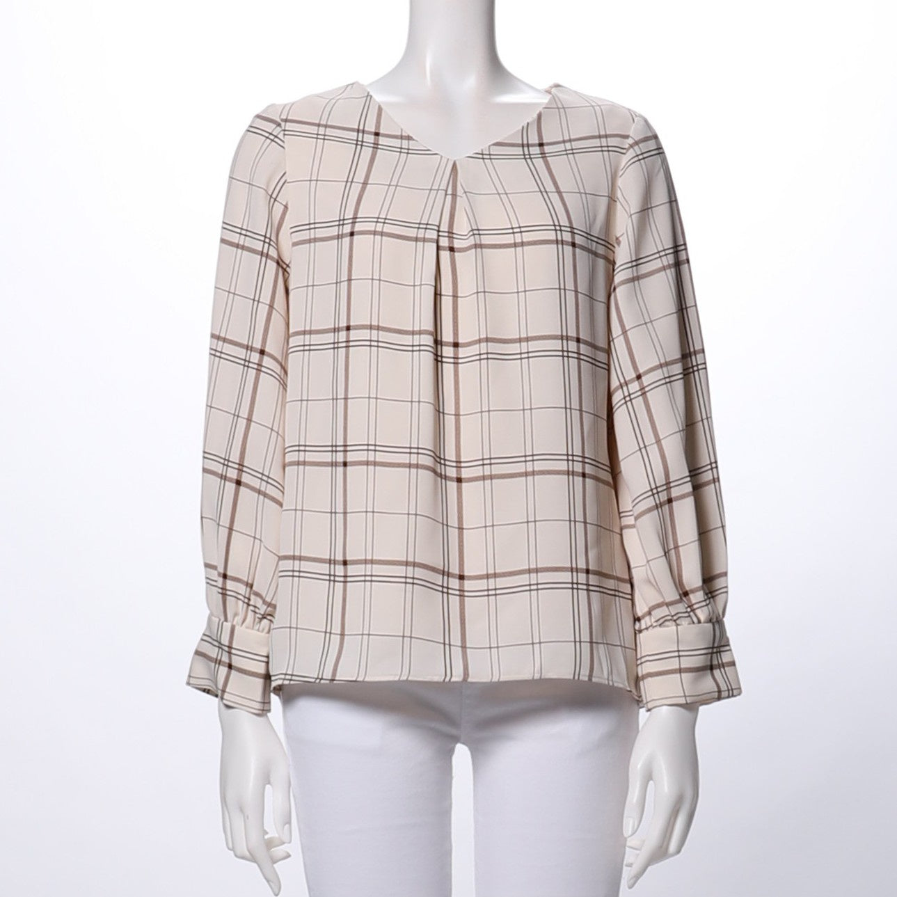チェック柄のVネックブラウス。ボトムスはシンプルなものを選ぶとバランスが良くなります。タイトスカートを合わせて女性らしい着こなしに、センタープレス入りワイドパンツを合わせてきれいめカジュアルに仕上げても良いですね。