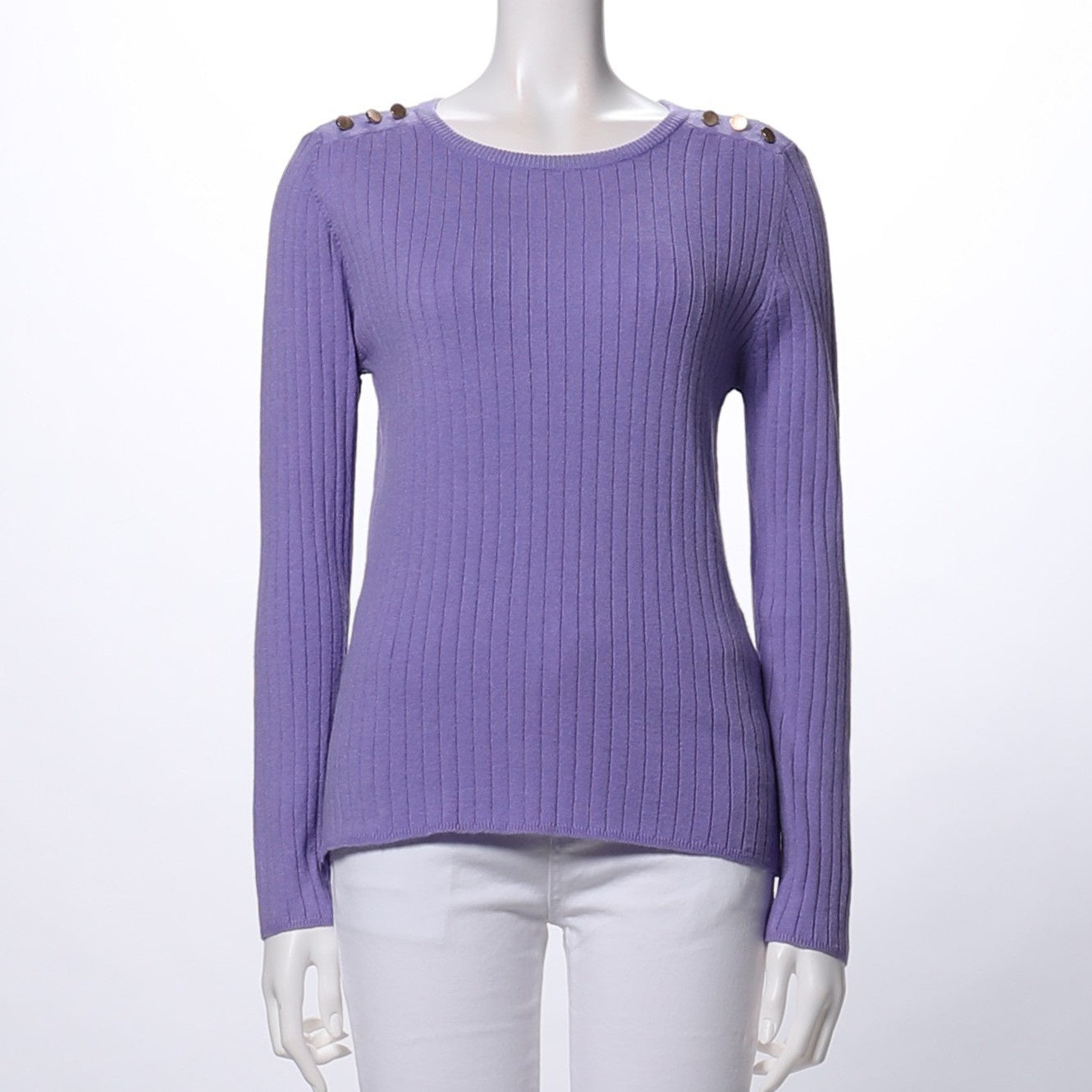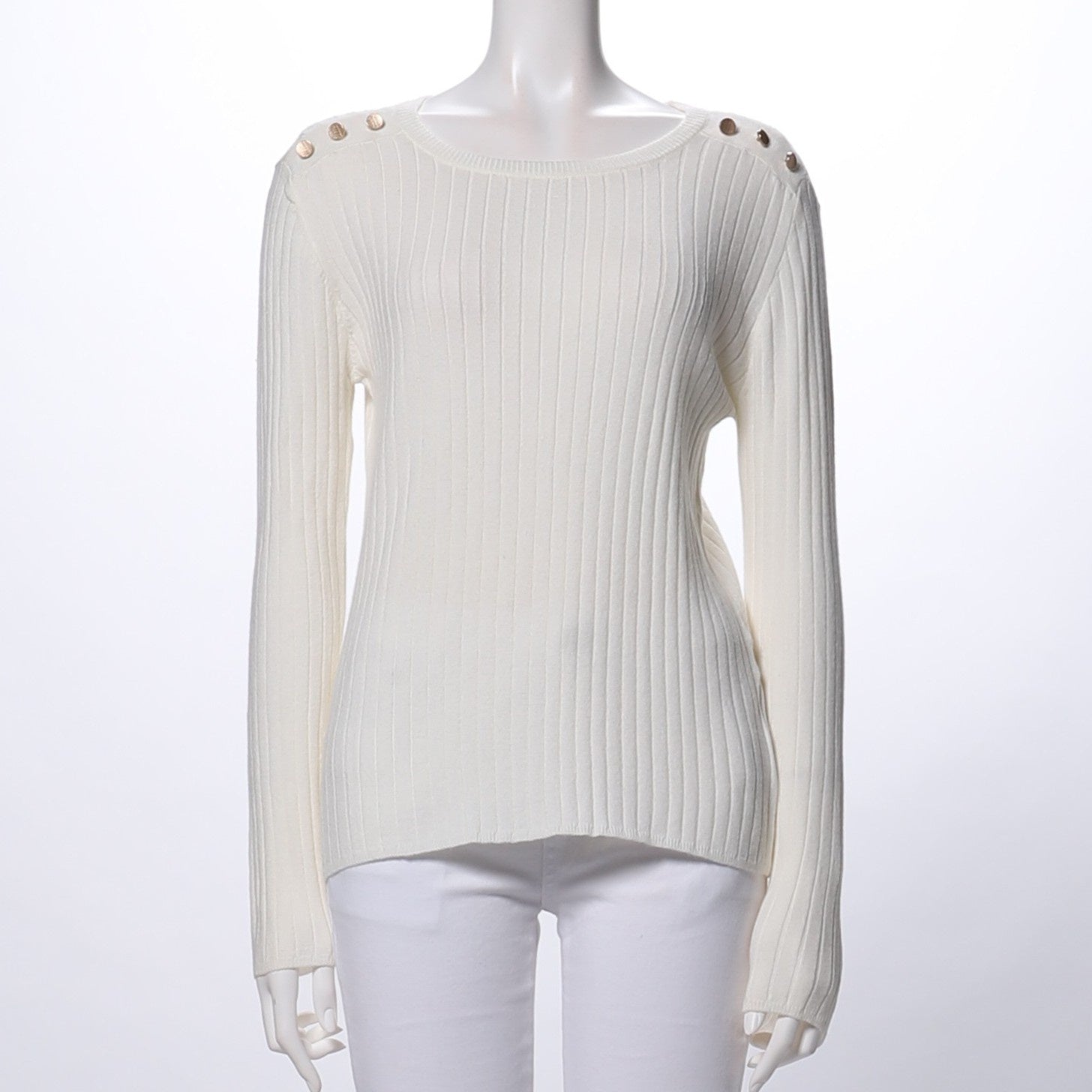 肩のボタンがワンポイントのリブニット。Aラインスカートとラウンドトゥパンプスを合わせて女性らしく着てもいいですし、ワイドパンツとショートブーツを合わせてカジュアルな着こなしもいいですね。