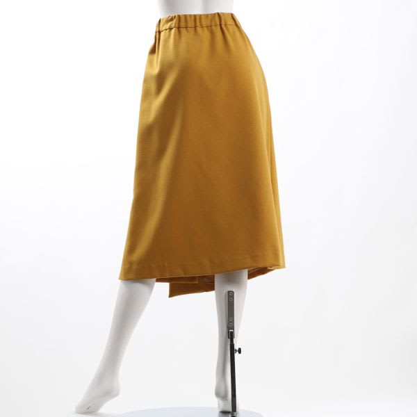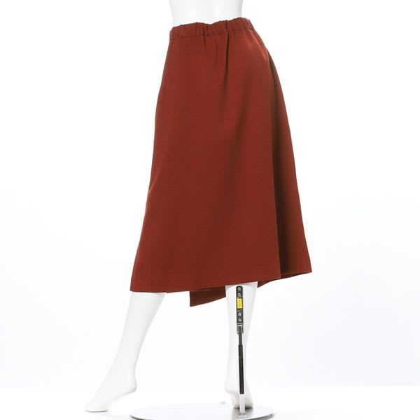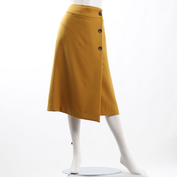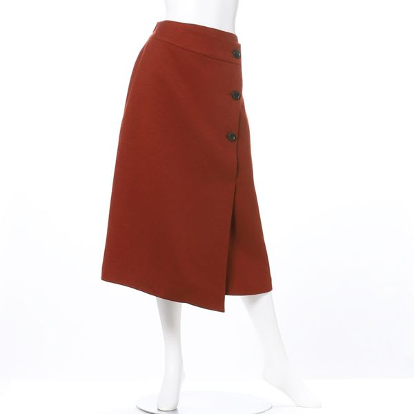 ボタンがアクセントのラップ風スカート。フリルネックブラウスを合わせてフェミニンスタイルに、オフタートルネックニットを合わせて大人カジュアルスタイルもおすすめです。