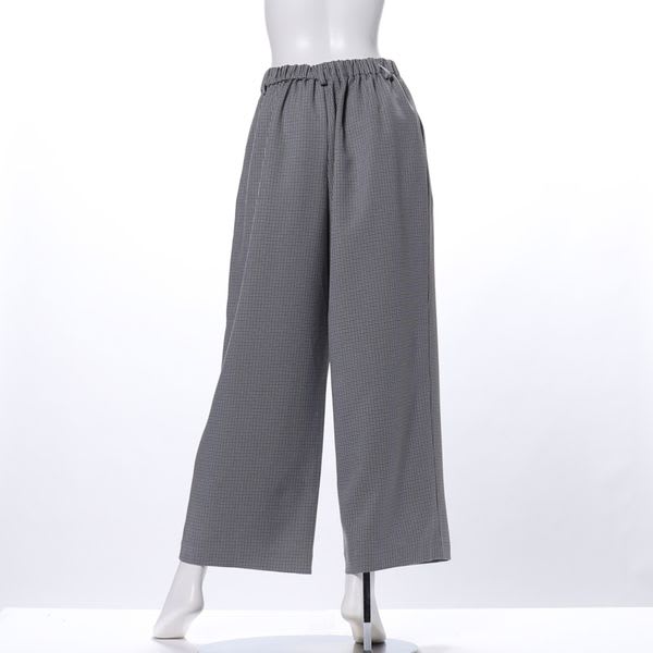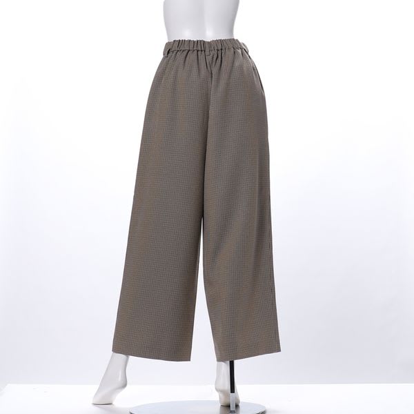 ガンクラブチェック柄のワイドパンツ。後ろウエストがゴム仕様なので着心地が良いのも嬉しいですね。シャツを合わせてきちんと感のあるコーディネートに、ローゲージニットを合わせてカジュアルに着るのも良いですね。