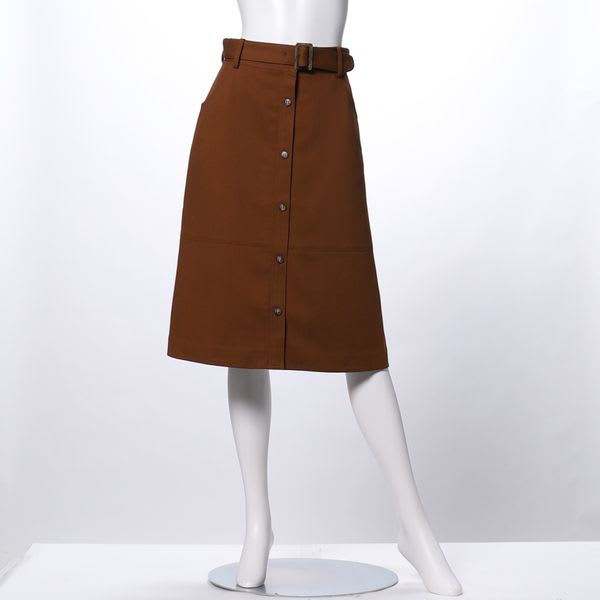 フロントのボタンデザインがポイントのウエストベルト付きスカート。フリルネックブラウスを合わせてフェミニンスタイルに、リブニットを合わせてきれいめカジュアルに着こなしてもおすすめです。
