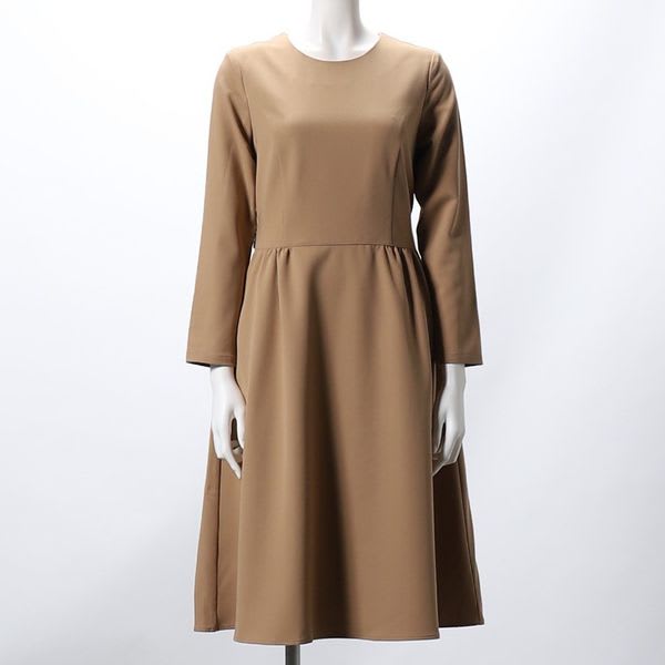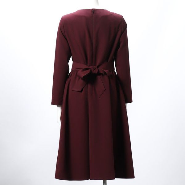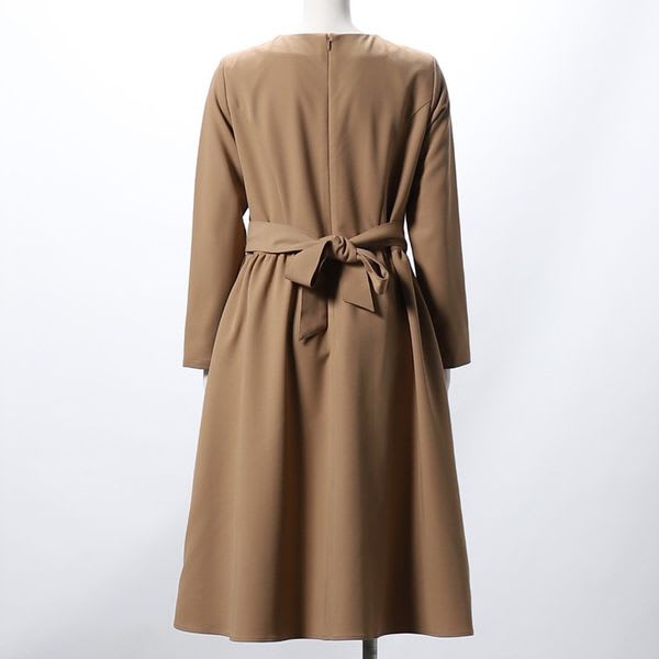 様々なシーンで活躍するラウンドネックワンピース。ウエストのベルトは前でリボンに結んでも、後ろで結んでも◎