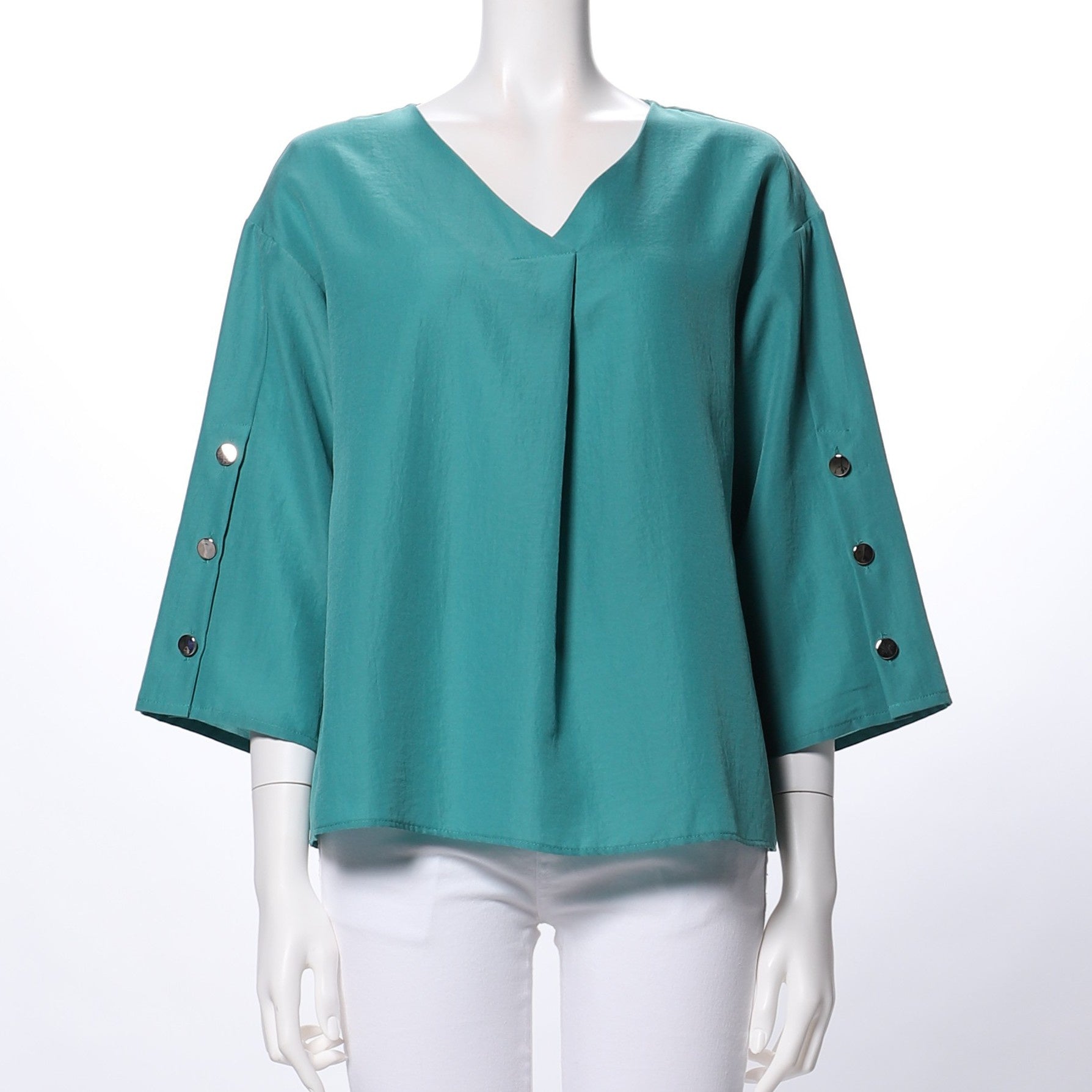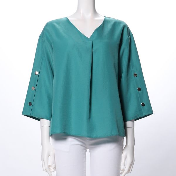 お袖の金ボタンデザインがポイントのVネックブラウスです。デニムパンツとスニーカーを合わせてカジュアルなスタイルや、フレアスカートとポインテッドトゥパンプスを合わせてレディライクなスタイルもおすすめですよ。