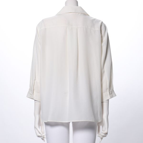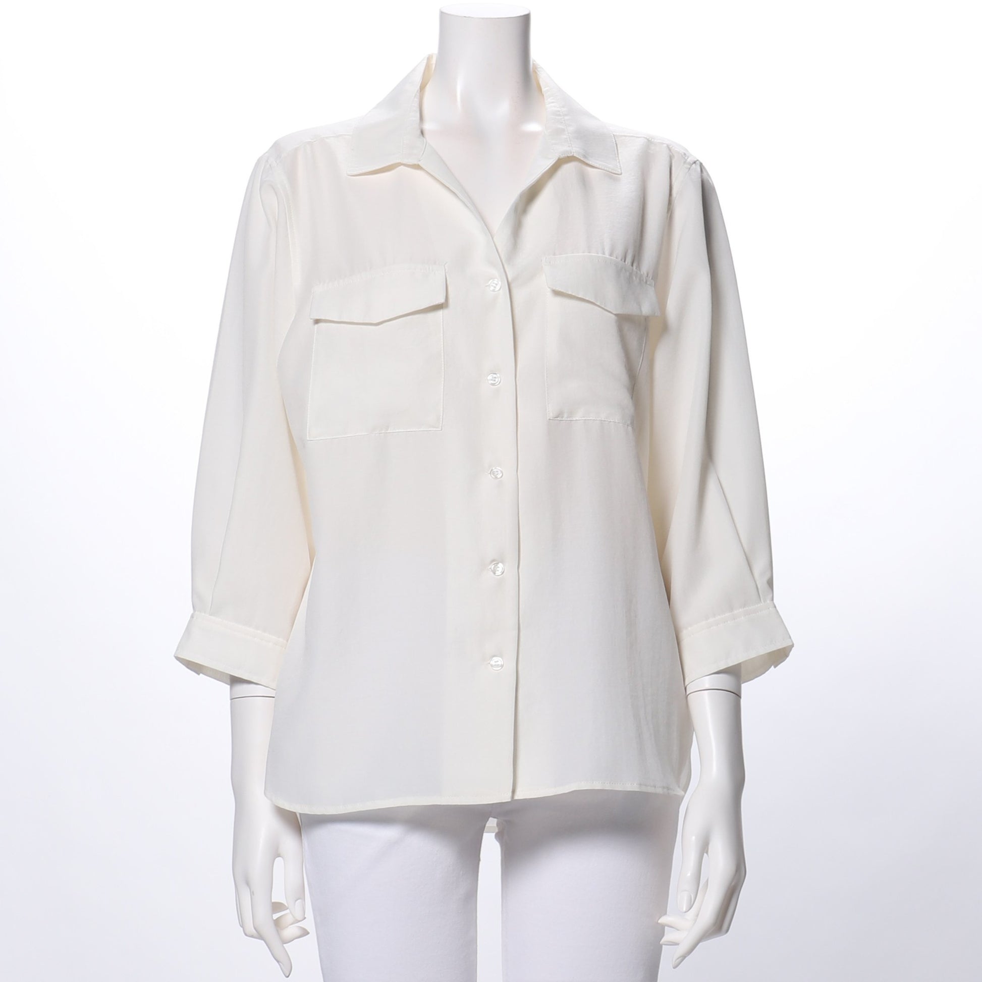 フラップポケット付きのスキッパーブラウスです。テーパードパンツとフラットパンプスを合わせてキレイめカジュアルなスタイルや、タイトスカートとポインテッドトゥパンプスを合わせてレディライクなスタイルも素敵ですよ。