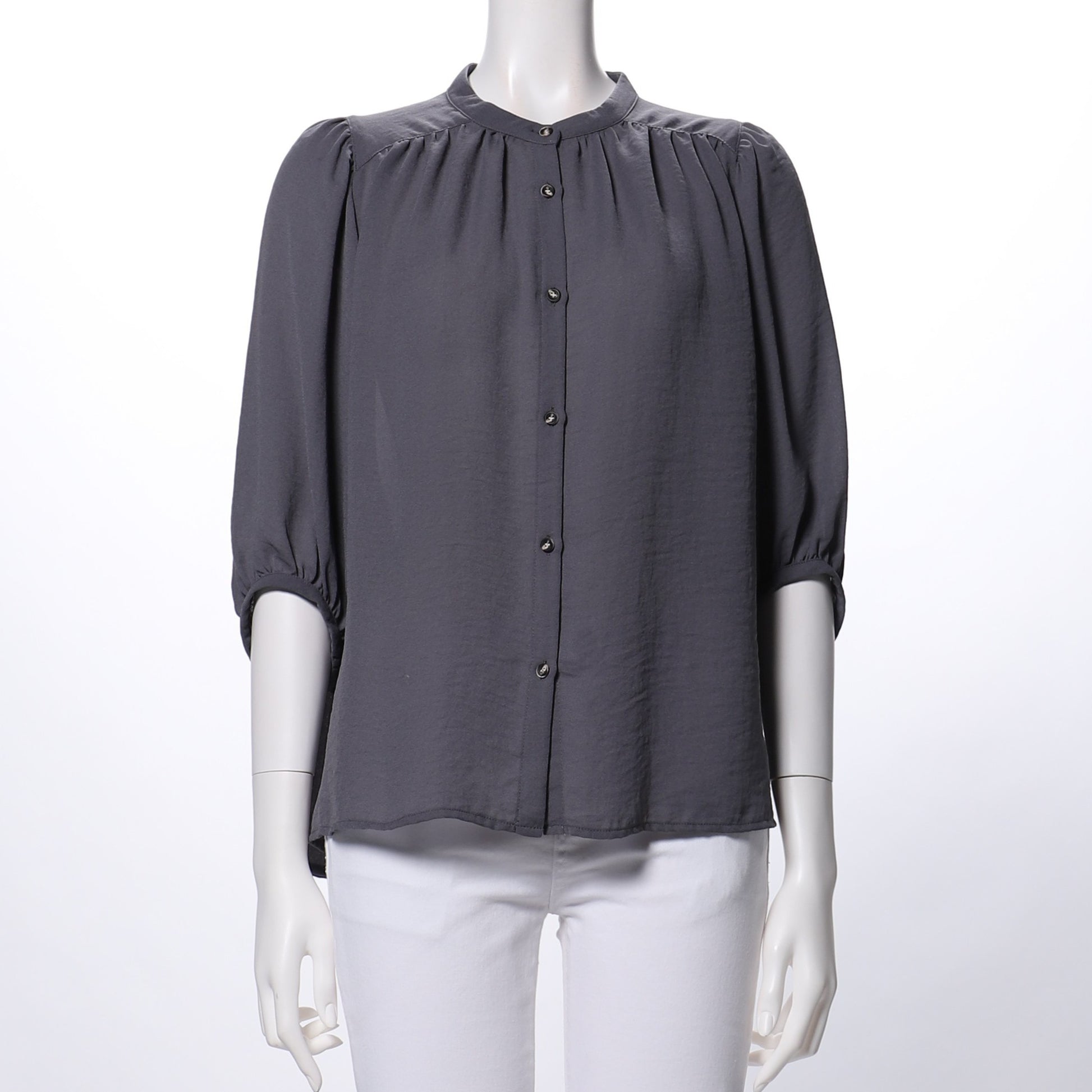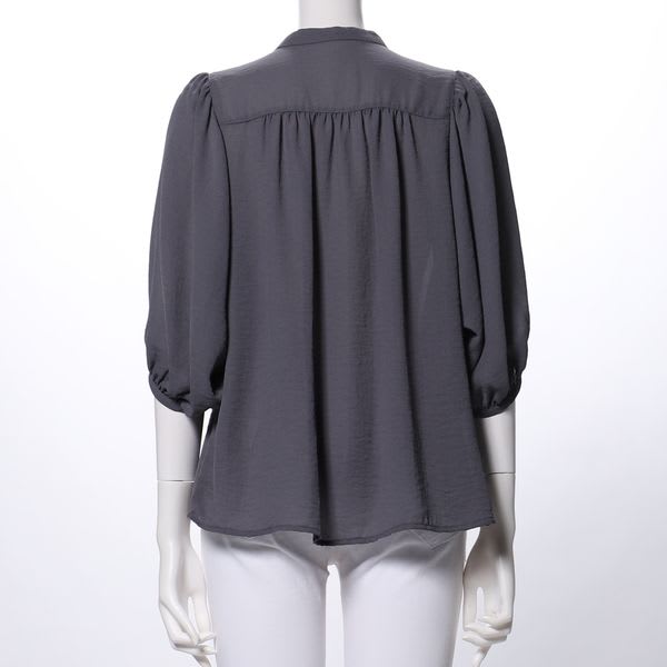 バンドカラーブラウスです。フレアスカートとラウンドトゥパンプスを合わせてレディライクなスタイルや、ワイドパンツとバレエシューズを合わせてカジュアルなスタイルも素敵ですよ。