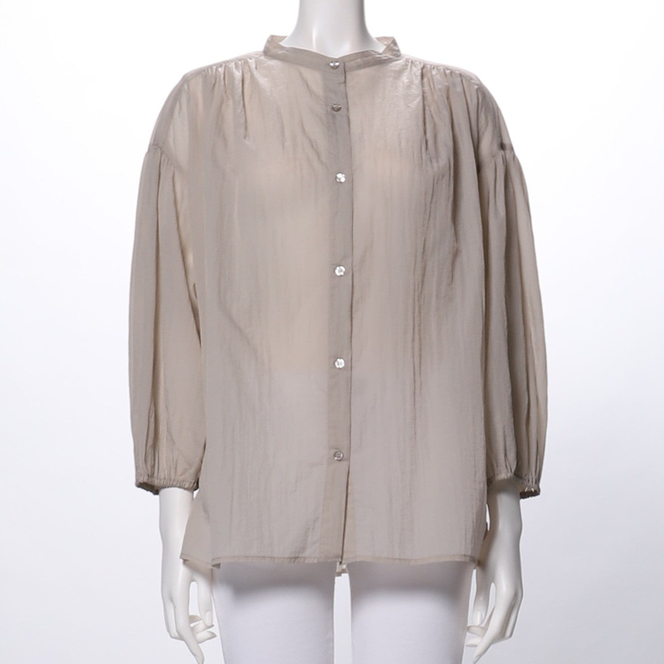 ギャザーがポイントのバンドカラーブラウスです。テーパードパンツとフラットシューズを合わせてカジュアルに、タイトスカートとポインテッドトゥパンプスを合わせてレディライクなスタイルもいいですね。