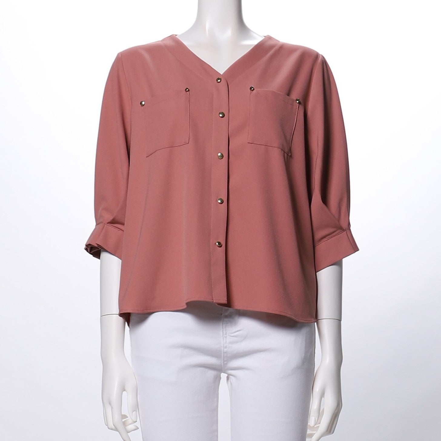 ボタンデザインがポイントのVネックブラウス。フレアワイドパンツを合わせてモードスタイルに、セミタイトスカートを合わせてハンサムレディスタイルも良いですね。