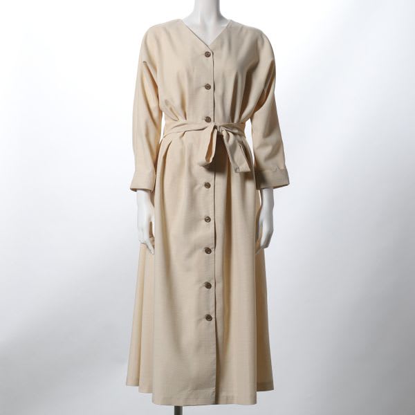 フロントボタンのベルト付きワンピース。ヒールパンプスを合わせてレディライクな着こなしに、スニーカーを合わせてカジュアルな着こなしもいいですね。(前を開ければ羽織としても着ていただけます)