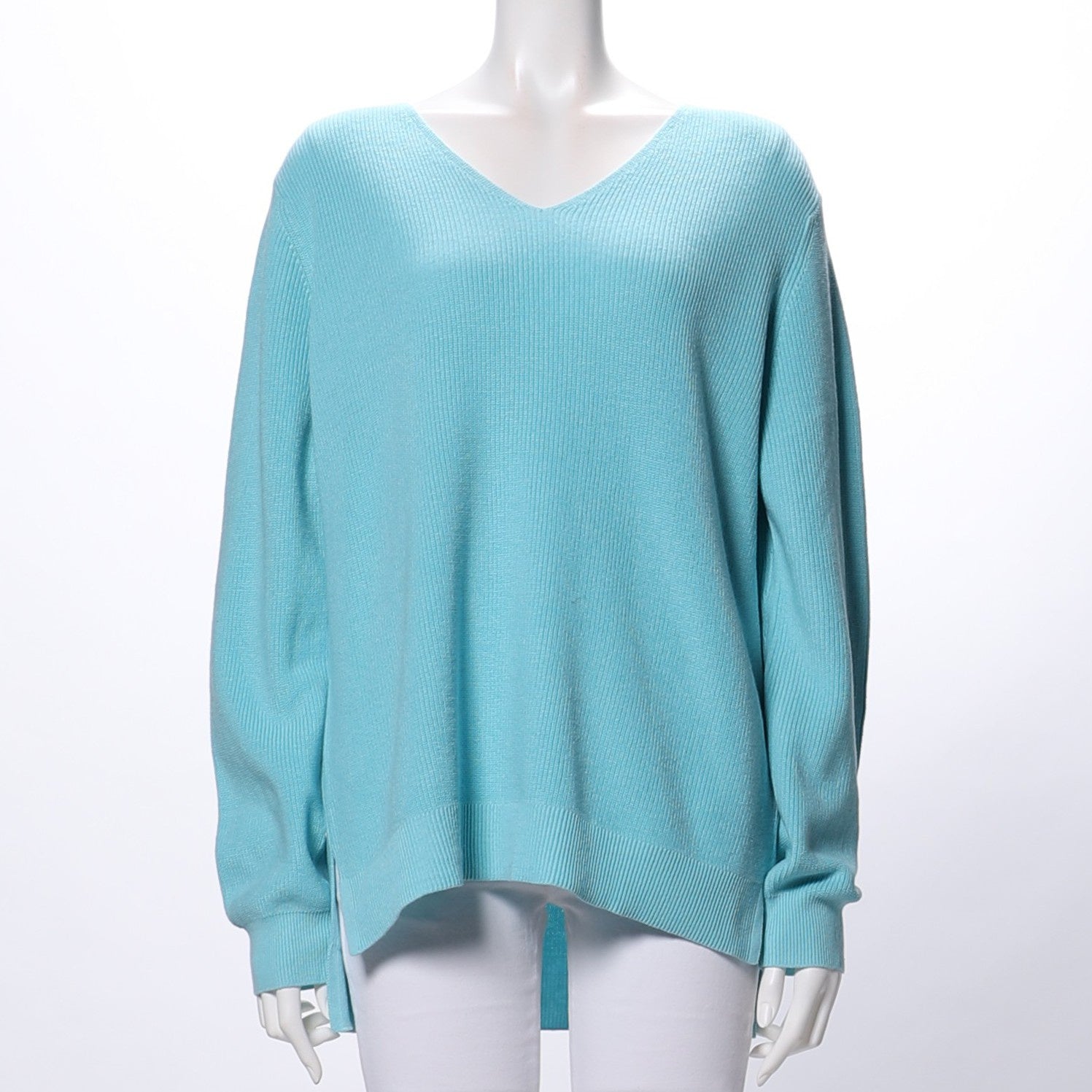 「「青」の中でも、とても好きな色味でした。気分が明るくなりました。有難うございます。胸が小さく、鎖骨下の骨(胸骨?)が見えることで、ガリガリで不健康そうな印象を与えてしまうのが悩みです。Vネックは好きですが、もう少し浅いものをお願いします。」
