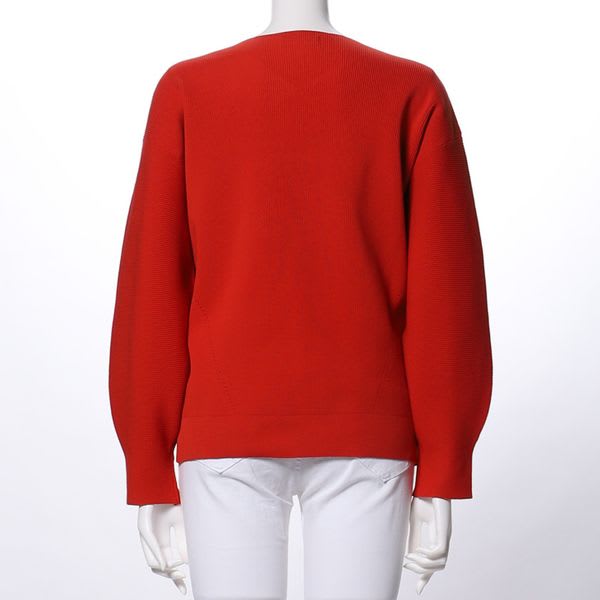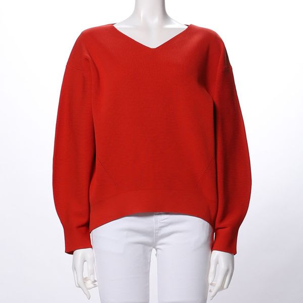Vネックのバルーンスリーブニット。ワイドパンツと合わせてきれいめカジュアルスタイルにしてみたり、フレアスカートと合わせて大人可愛めスタイルにしてみても良いですね。