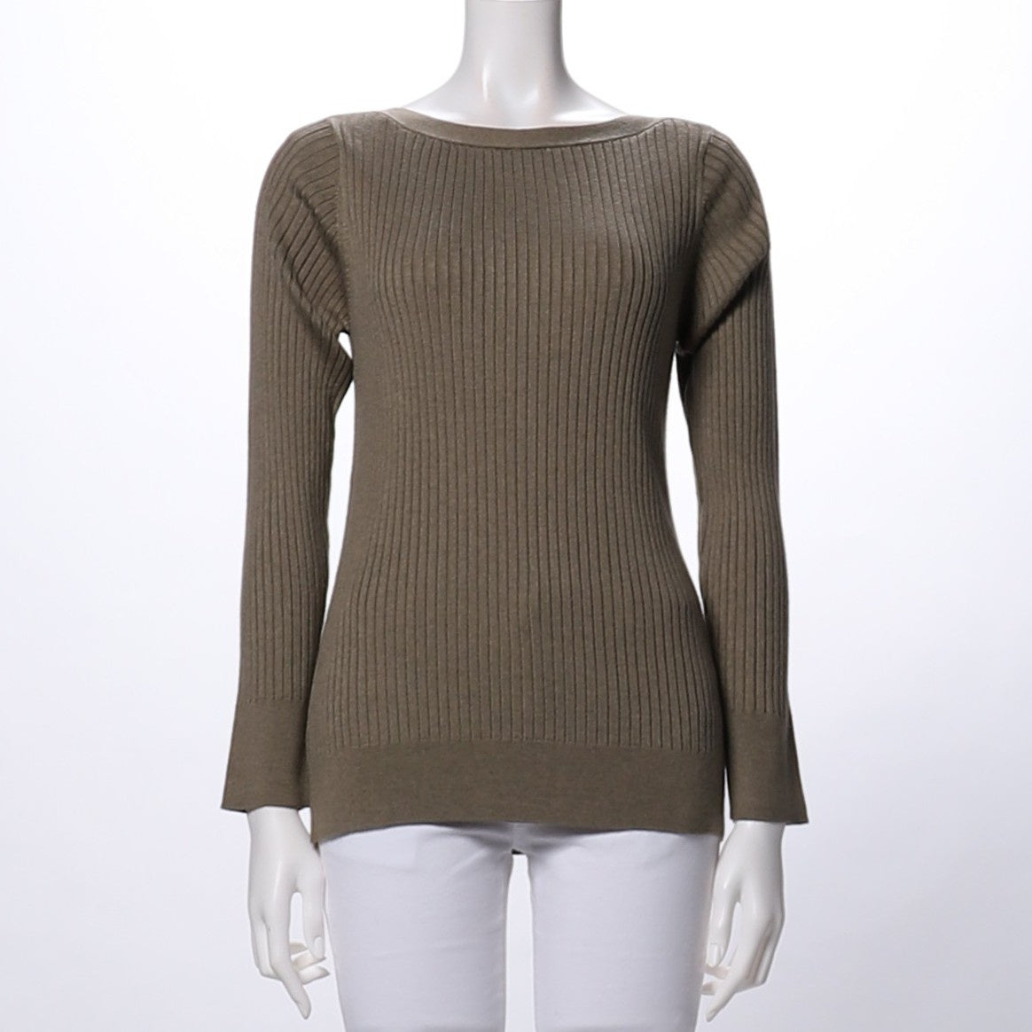ボートネックのリブニットです。フレアスカートとラウンドパンプスを合わせて女性らしいスタイルに、テーパードパンツとポインテッドトゥパンプスを合わせてクールなスタイルも素敵ですよ◎