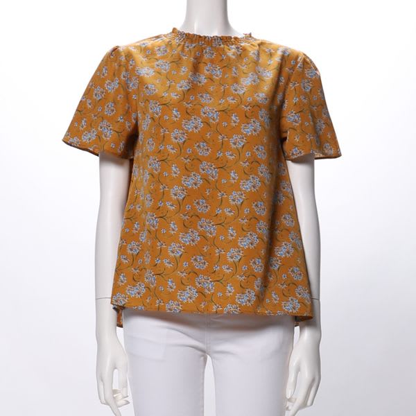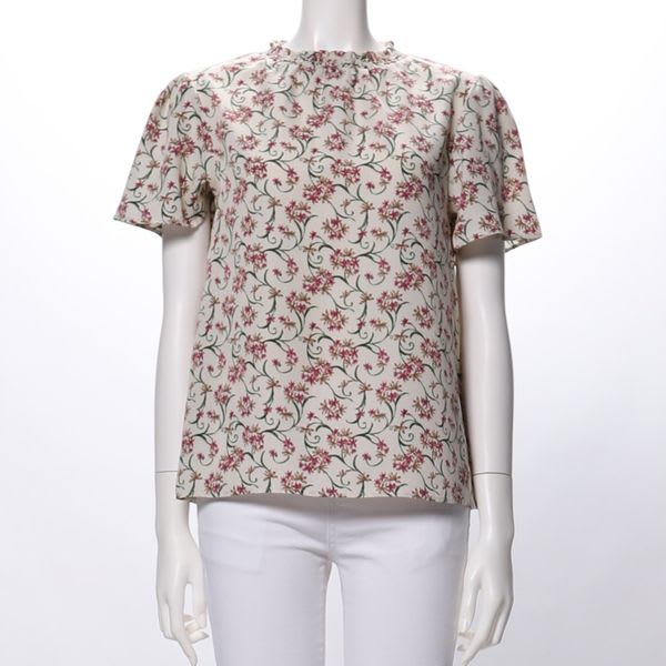 程よく詰まったネックラインがポイントの花柄ブラウス。