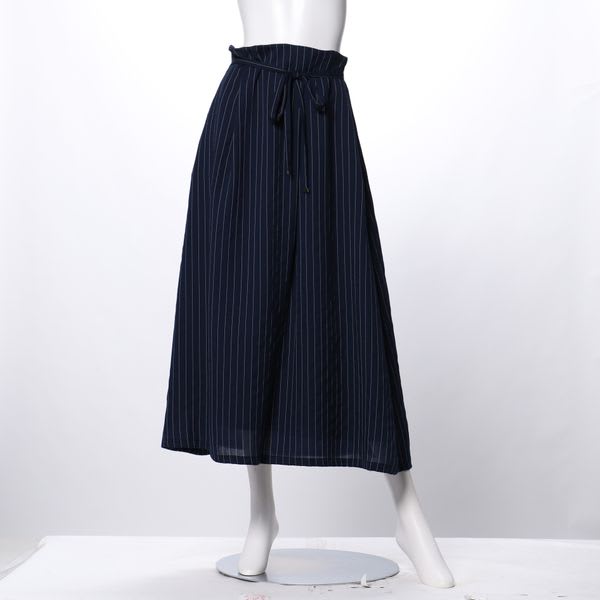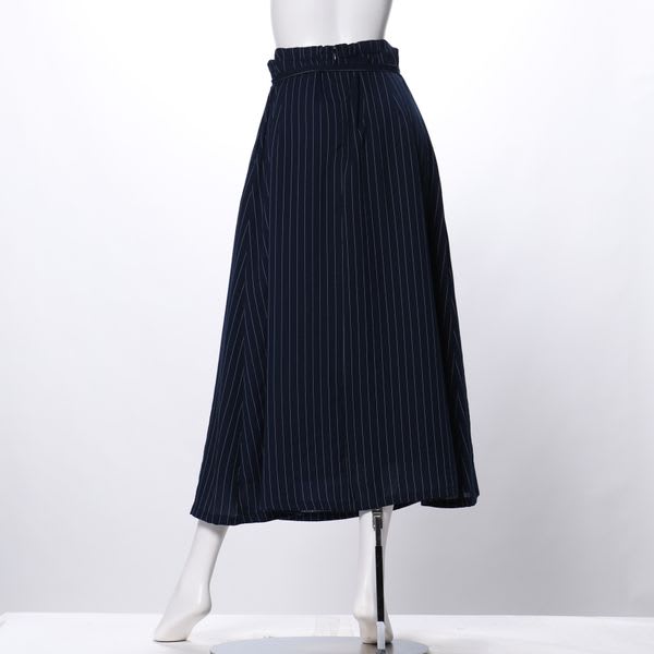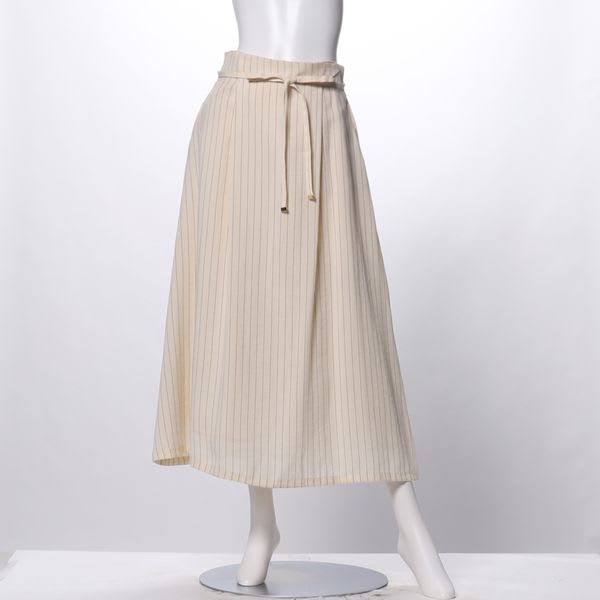リボンベルト付きのストライプ柄スカート。とろみブラウスとパンプスを合わせて女性らしいスタイルに、カットソーとスニーカーを合わせてカジュアルスタイルもおすすめです◎