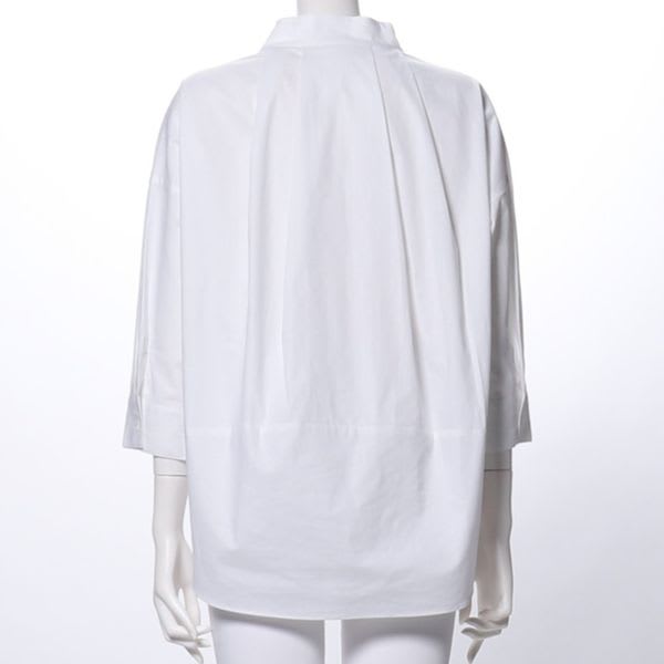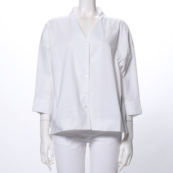Vネックのフロントボタンブラウスです。軽く抜き襟にしてワイドパンツと合わせればこなれ感のある着こなしになりますし、ロングフレアスカートを合わせてゆるっとしたスタイルも◎。