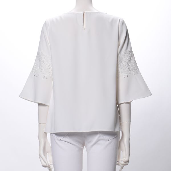 「ベルスリーブにお花のレース。おお、若い子向け、と思ったけれど、意外と似合いました。ブラックのストレートパンツに合わせて、モードっぽく着るとカッコよかったです。」