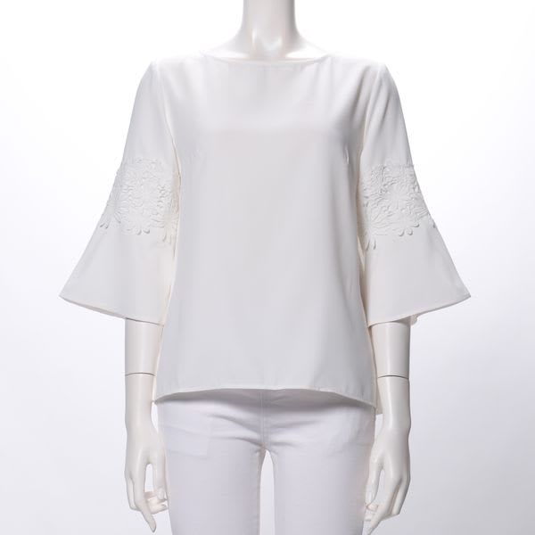 お袖のレースやフレア感がポイントのボートネックブラウスです。タイトスカートとパンプスを合わせてレディライクなスタイルや、クロップドパンツとスニーカーを合わせてカジュアルなスタイルもおすすめですよ。