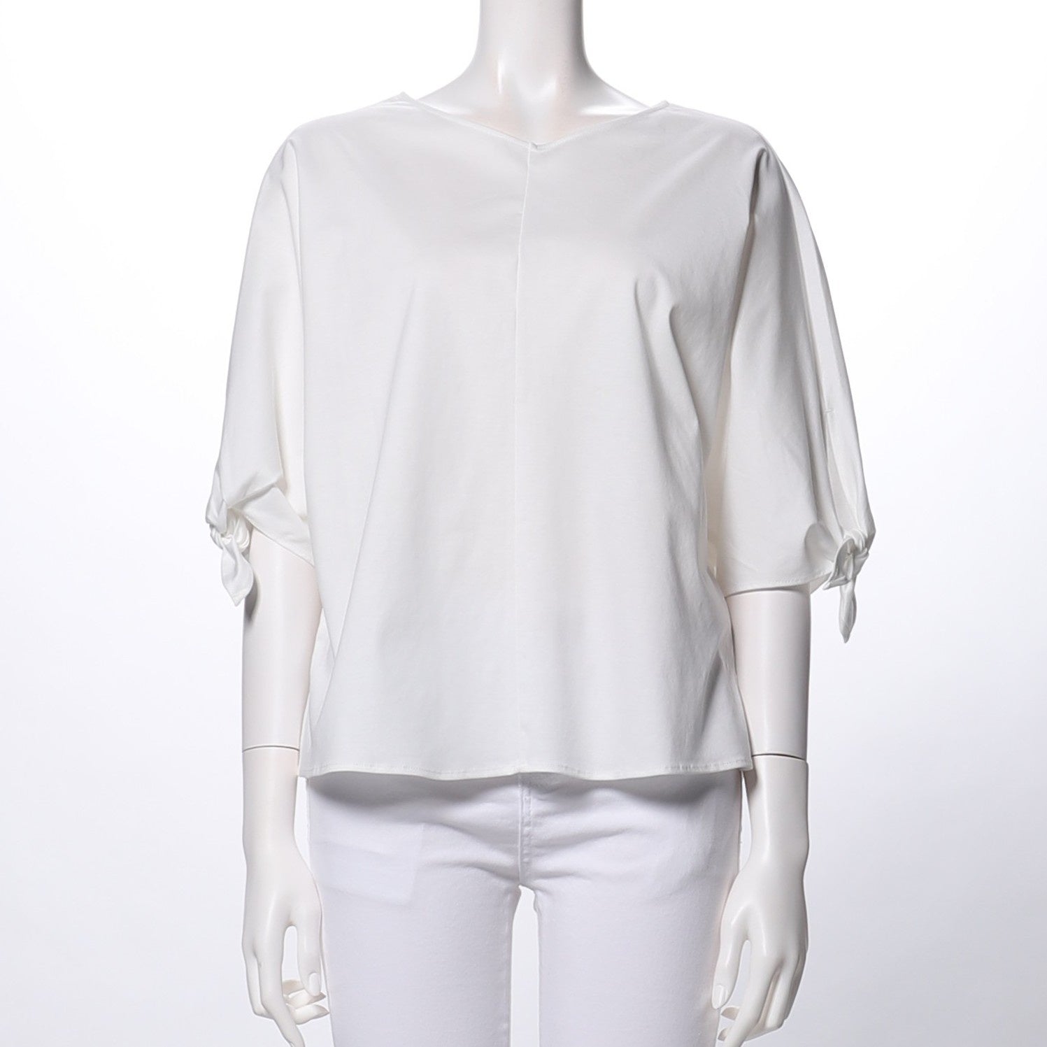お袖のリボンが女性らしい印象のVネックカットソー。セミタイトスカートを合わせてレディライクに、ワイドパンツを合わせてカジュアルスタイルも良いですね。