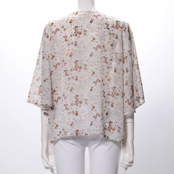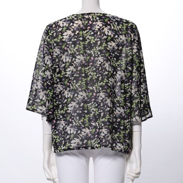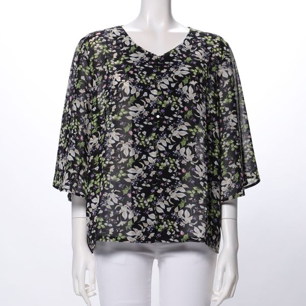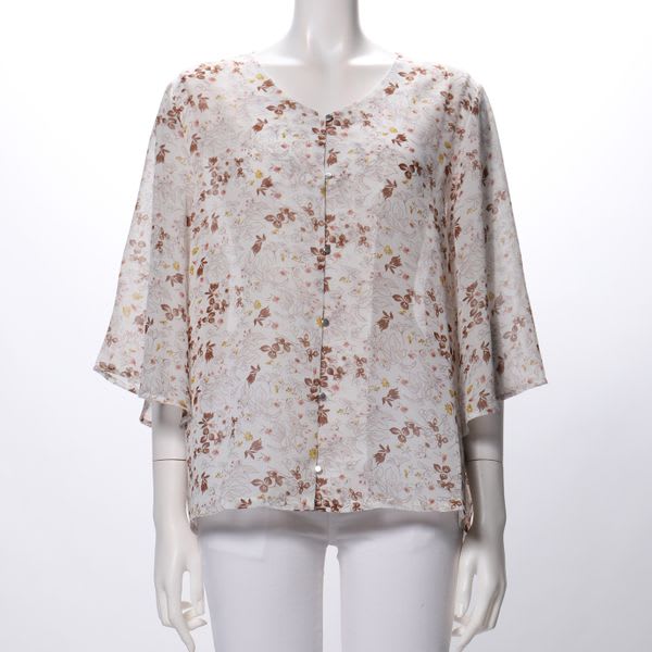 Vネックがすっきりとした印象の総柄ブラウスです。テーパードパンツとフラットシューズを合わせてカジュアルなスタイルや、フレアスカートとパンプスを合わせて上品なスタイルも素敵ですよ。