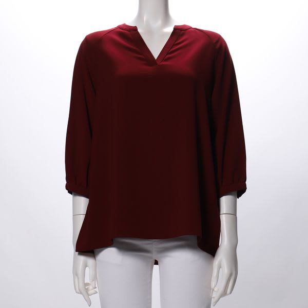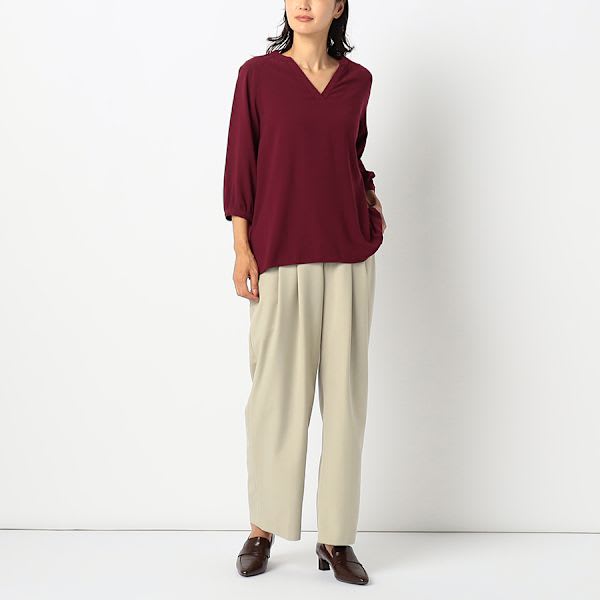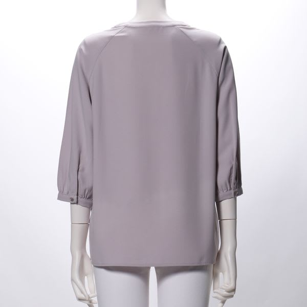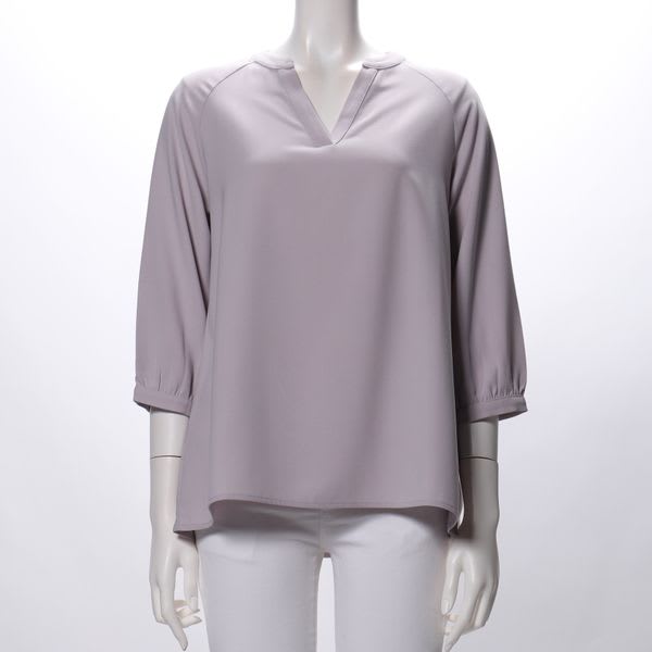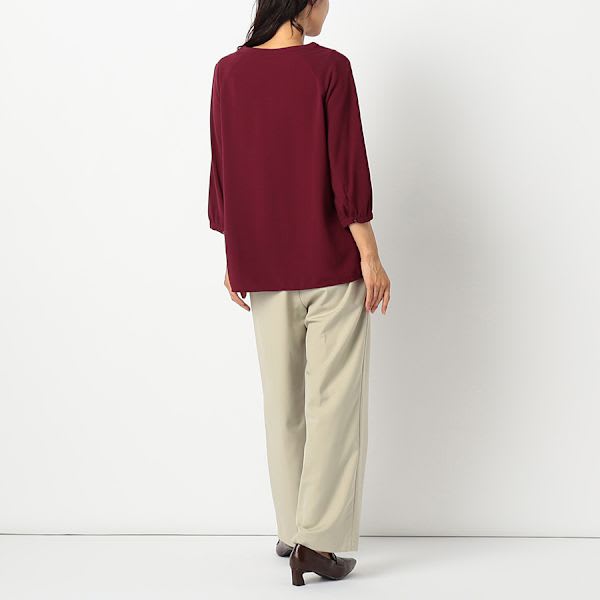 ラグランスリーブデザインのオープンフロントネックブラウスです。テーパードパンツとポインテッドトゥパンプスを合わせてキレイめスタイルや、ロングギャザースカートとフラットシューズを合わせてカジュアルなスタイルもおすすめですよ。