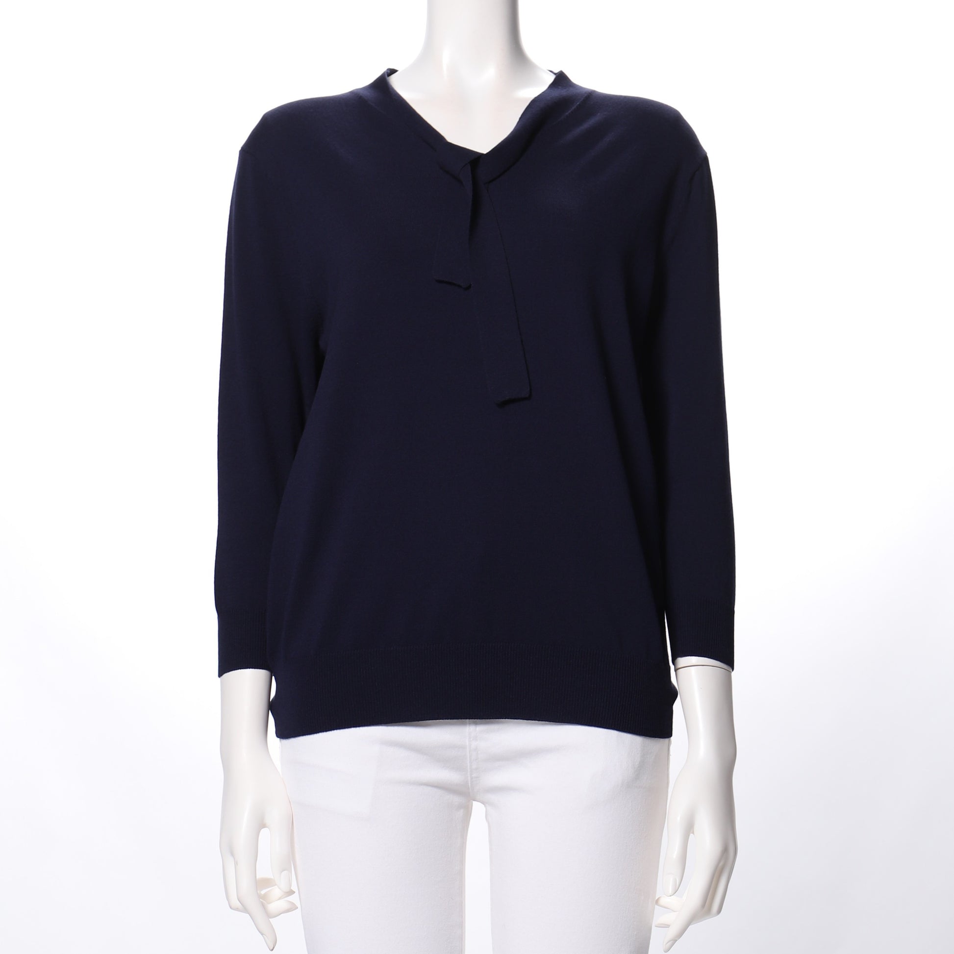 ボウタイがポイントのニットです。ボウタイは一重に結んでご着用くださいね。フレアスカートとパンプスを合わせてレディライクなスタイルや、テーパードパンツとフラットシューズを合わせてカジュアルなスタイルも素敵ですよ。