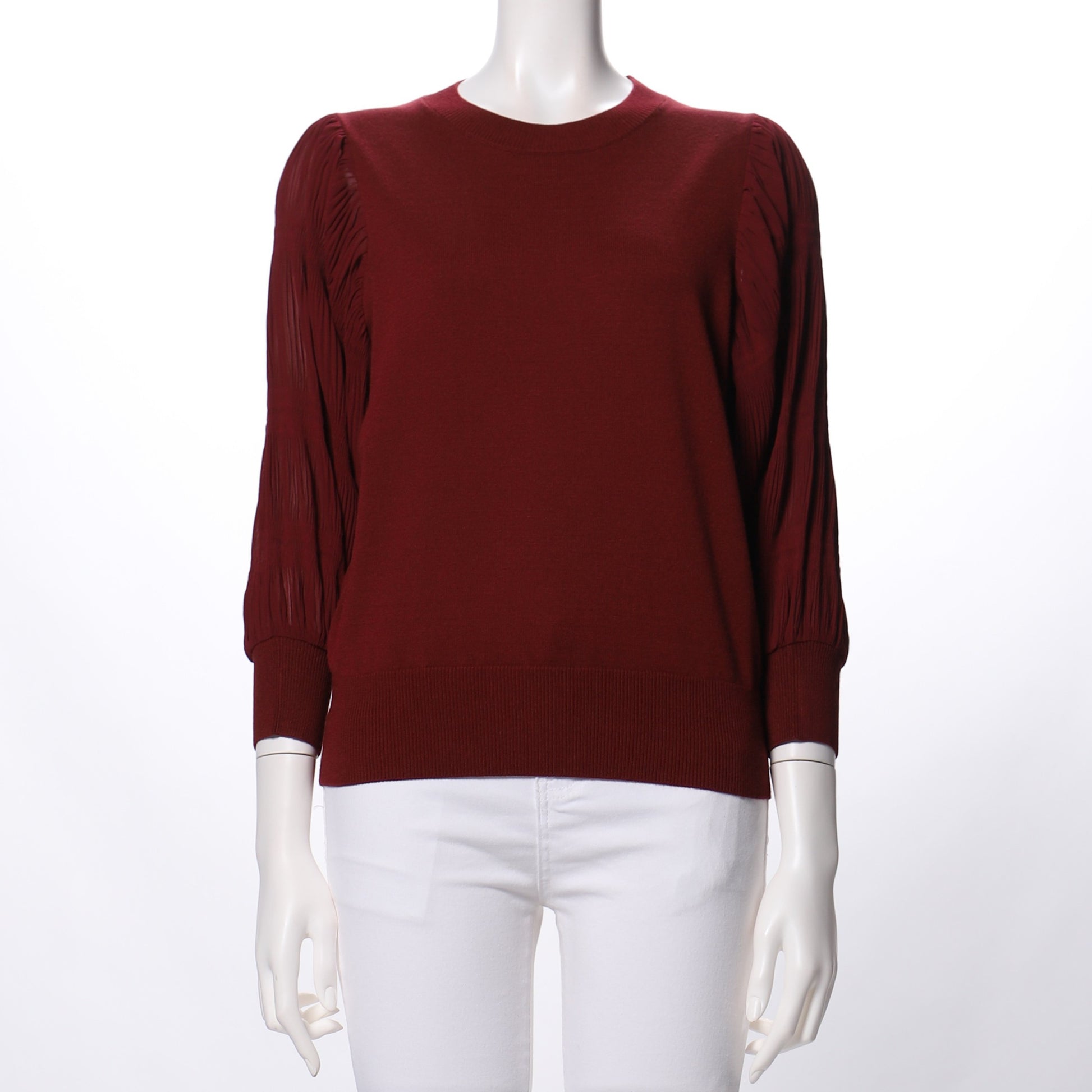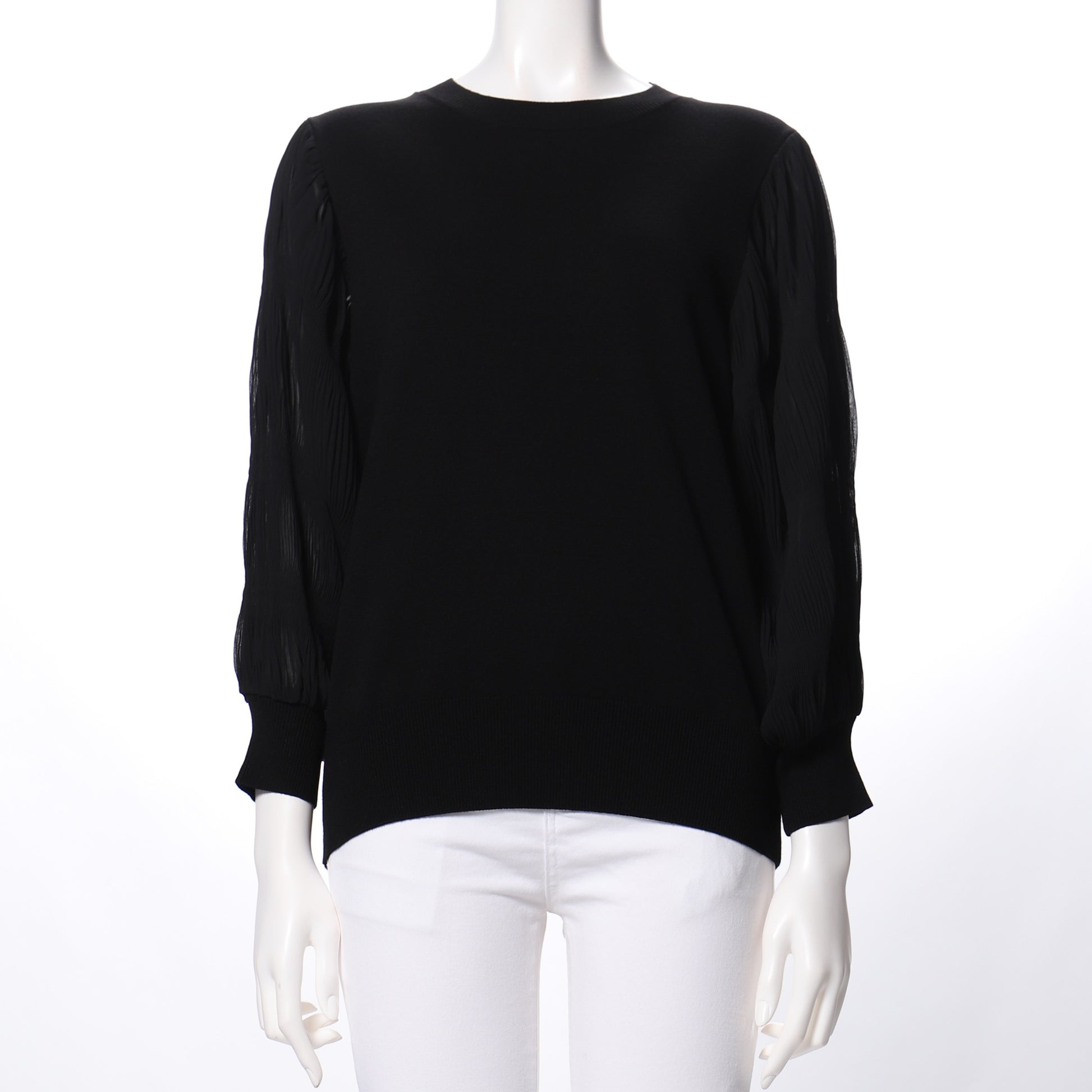 お袖のシフォンプリーツの透け感が特徴的なニット。ハイウエストテーパードパンツにフラットパンプスを合わせてスタイリッシュコーデに、膝下のタイトスカートにヒールパンプスを合わせてエレガントな着こなしも◎ですよ!
