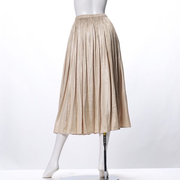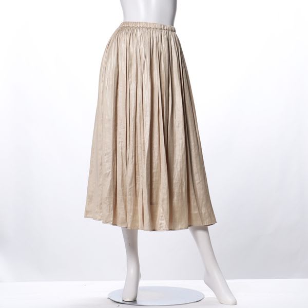 レザー見えするサテン素材のギャザースカートです。コンパクトなハイゲージニットと合わせてカジュアルスタイルに、スタンドカラーブラウスと合わせたレディライクなスタイルも良いですね。