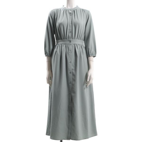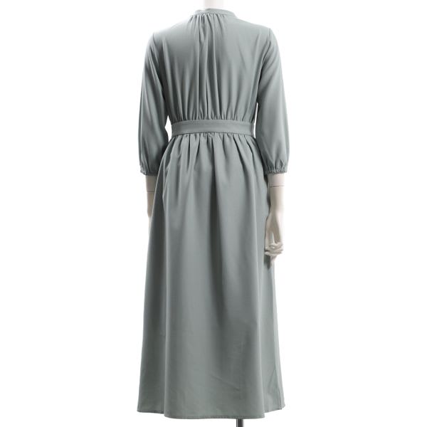 フロントボタンのギャザーワンピース。レザーのハンドバッグとポインテッドトゥパンプスを合わせてお仕事スタイルに、ショルダーバッグとバレエシューズを合わせてお出かけスタイルもおすすめです。